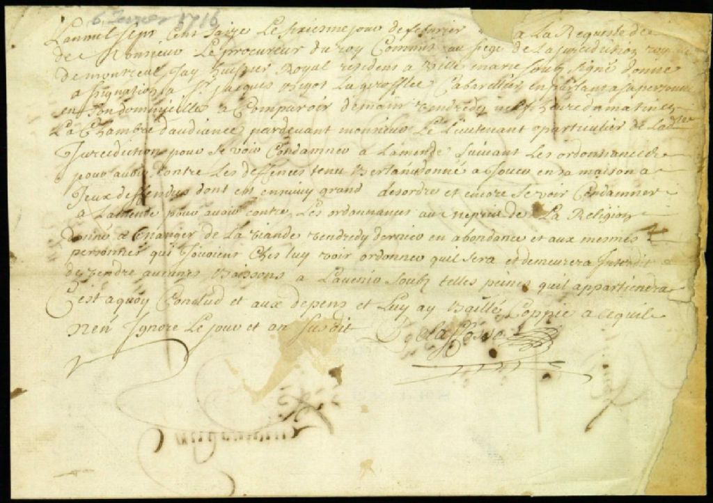 Procès contre Jacques Bigot dit Lagiroflée, cabaretier, accusé d'avoir contrevenu aux règlements du vendredi, 6 février 1716, Archives nationales à Montréal, Fonds Juridiction royale de Montréal, (06M,TL4,S1,D1855).