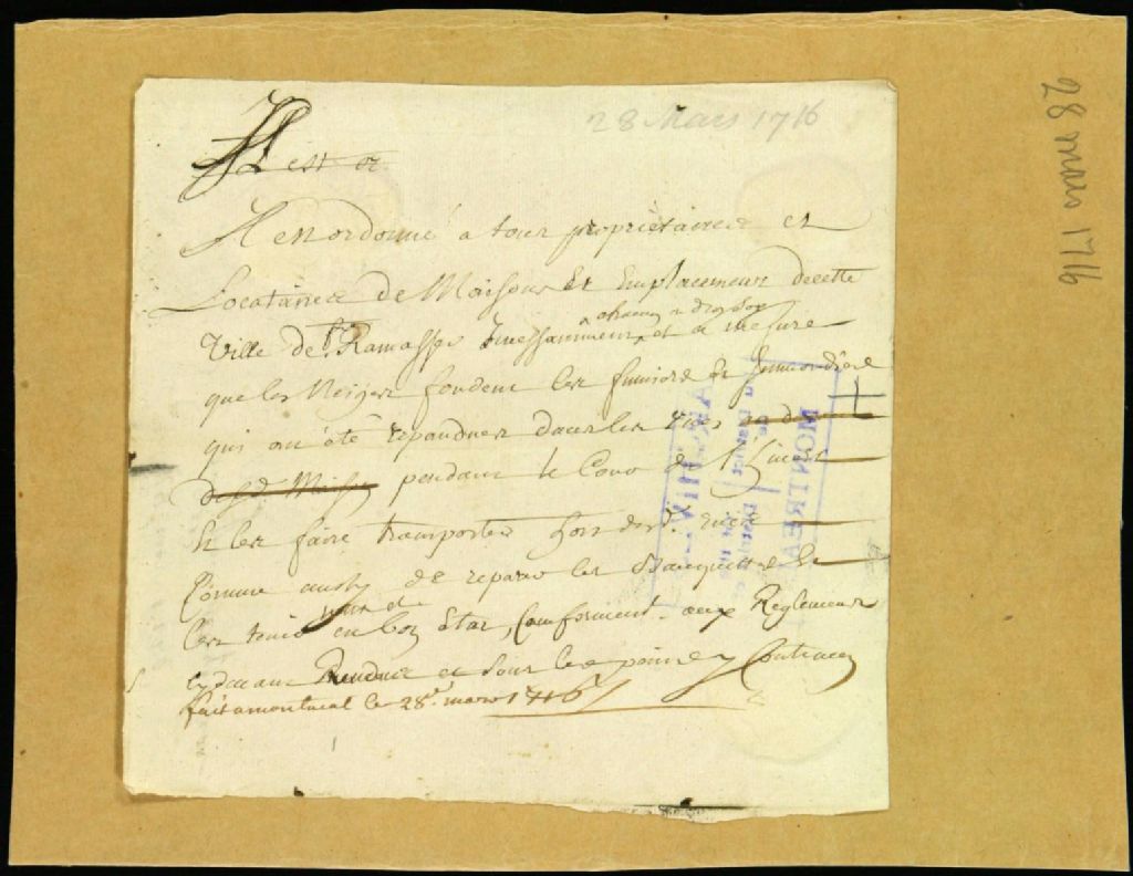 - Ce dossier d'administration civile se compose de l'ordonnance pour l'enlèvement des immondices et fumier des rues au fur et à mesure de la fonte des neiges, par les propriétaires de maisons et les emplacements et de les faire transporter en dehors de la ville