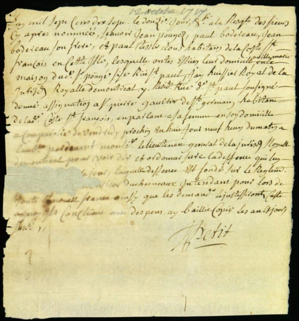 - Procès entre Jean Pouget, Paul et Jean Baudreau, et Paul Tessier, tous habitants de Côte-Saint-François, demandeurs, et Pierre Gauthier dit Saint-Germain, défendeur, pour l'arrêt de la construction d'une clôture