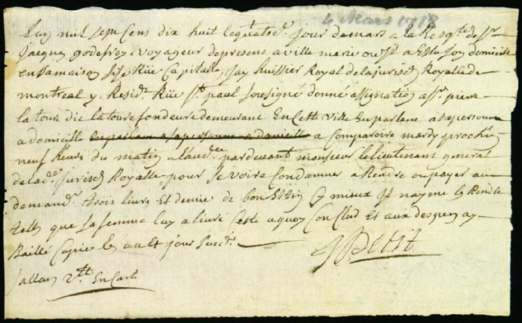 Procès entre Jacques Godefroy, époux de Marie Chesne, voyageur, demandeur, et Pierre Latour dit Latour, maître fondeur, défendeur, pour la restitution d'étain, 4 mars 1718 - 11 mars 1718, Archives nationales à Montréal, Fonds Juridiction royale de Montréal, (06M,TL4,S1,D2209).