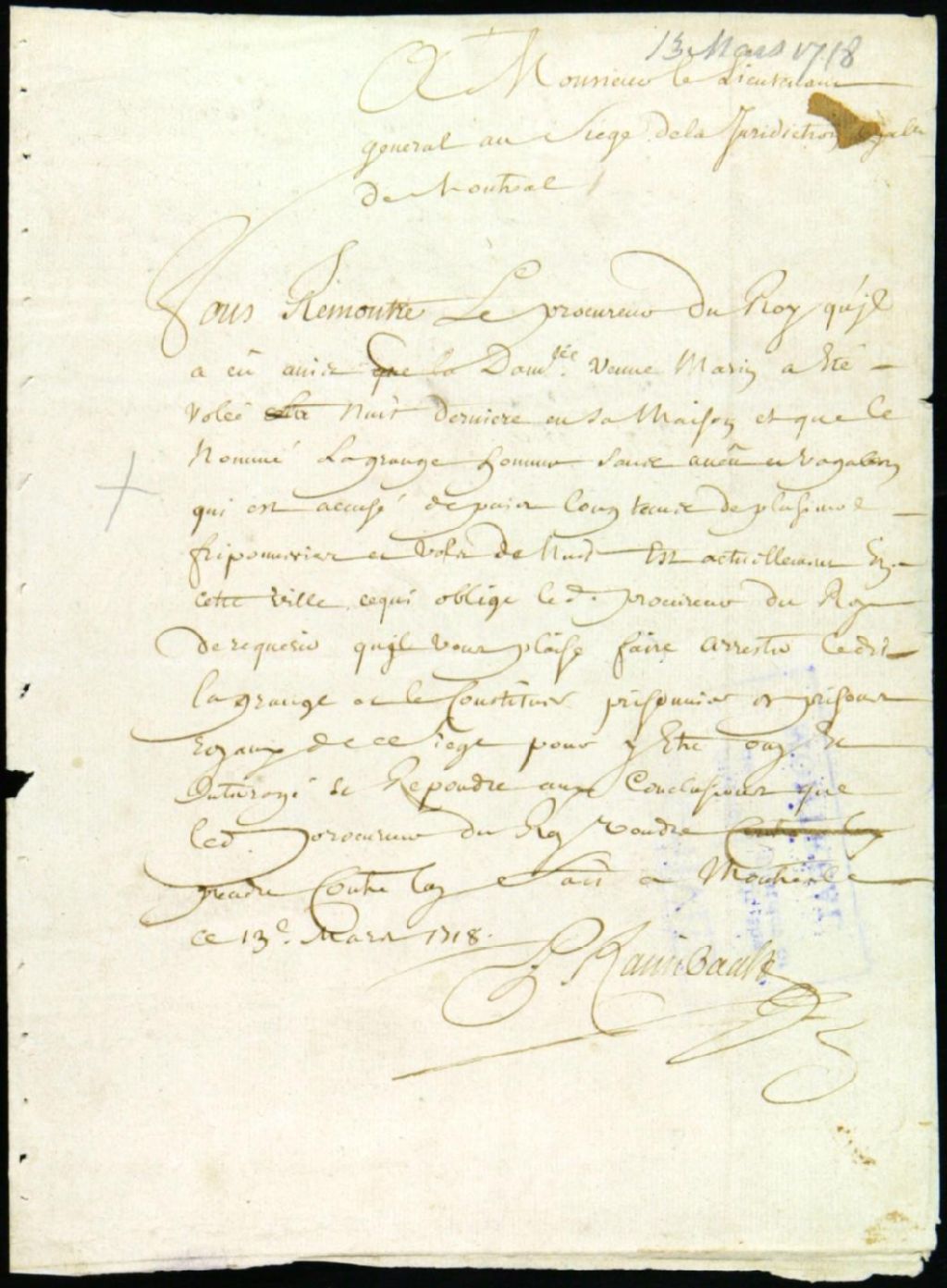- Ce dossier de matière criminelle est composé des pièces suivantes : le réquisitoire du procureur du roi au lieutenant général l'informant que la demoiselle Louise Lamy, veuve de Charles Marin de LaMargue, a été volée la nuit dernière et demandant l'arrestation et l'interrogatoire du vagabond Lagrange qui est soupçonné du vol ; l'interrogatoire de ce dernier ; l'ordre d'écrouer l'accusé ; l'information judiciaire ; la communication au procureur, lequel requiert un délai d'un mois pour prouver les faits ; et l'ordre d'élargir Lagrange vu que le procureur du roi a été incapable de ce faire. Les documents mentionnent Marie-Madeleine Dumouchel, épouse de Maurice, âgée de 40 ans, en tant que témoin et Marie Pécaudy, épouse de Jean-Louis de Lacorne, en tant qu'autre partie cambriolée
