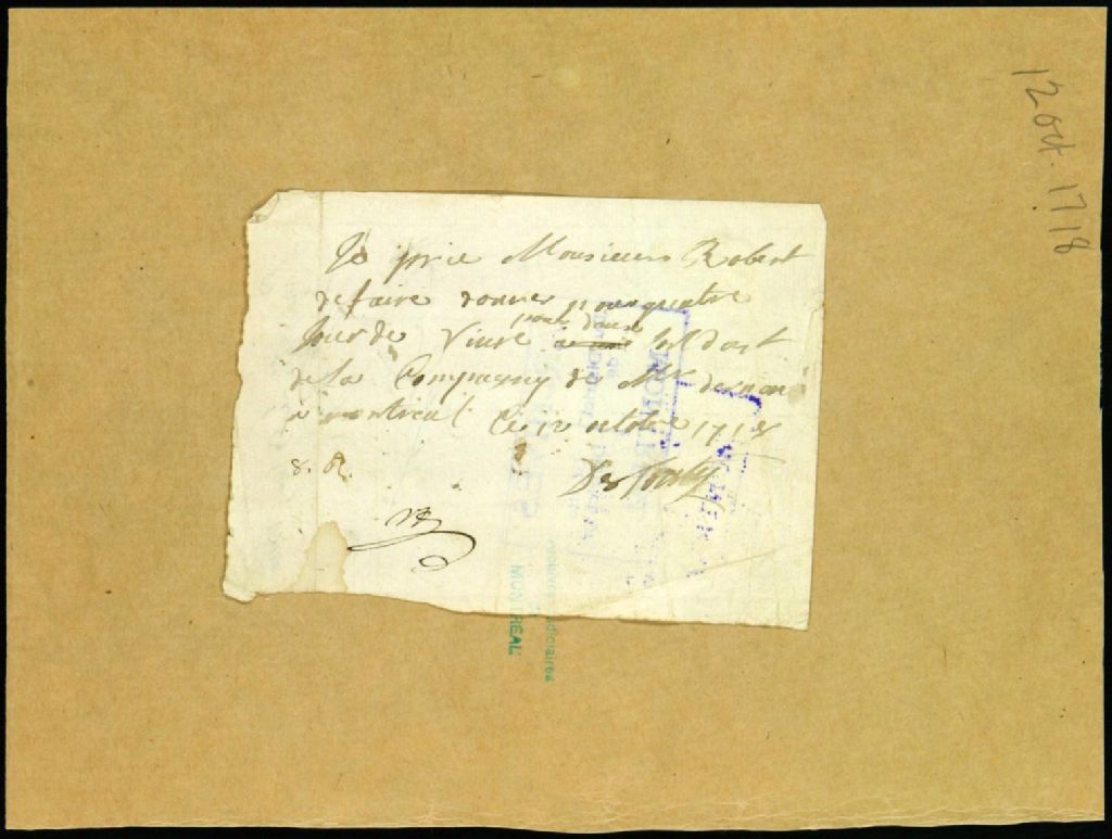 - Ce dossier d'administration militaire est composé de onze billets de provisions à fournir à des soldats de la compagnie de Dupont de Renom, adressés au garde magasinier du roi Étienne Rocbert, par de Tonty, entre le 12 octobre 1718 et le 9 mai 1719. Les billets sont tous endossés par le lieutenant général Bouat, le 3 mai 1720