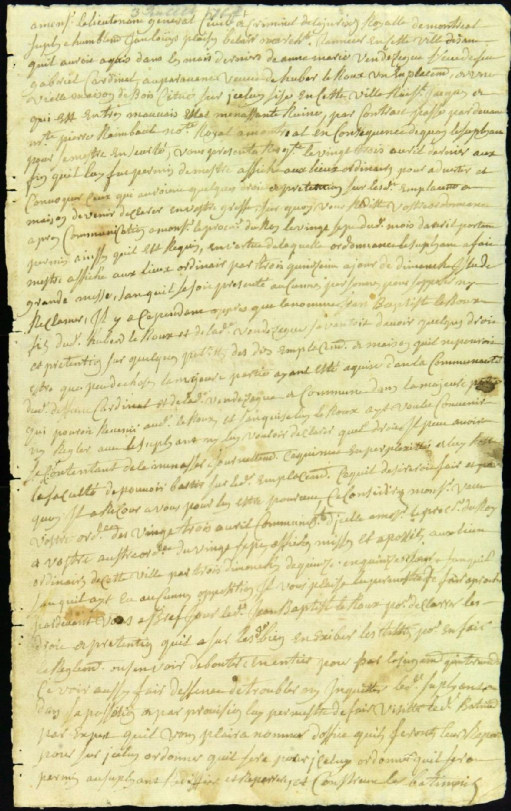 - Ce dossier de matière civile est composé des pièces suivantes : la requête de Jean-Louis Plessis pour faire assigner Jean-Baptiste Leroux à comparaître et à déclarer ses droits et prétentions sur un emplacement que le demandeur a acheté de sa mère, Anne-Marie Vanzègue, veuve de Gabriel Cardinal et de Hubert Leroux ; le jugement par défaut contre le défendeur non comparant ; la signification ; les assignations ; la transcription d'un acte d'opposition par Jean-Baptiste Leroux, disant être propriétaire de sept pieds de terrain ; l'appointement pour faire visiter la maison par des experts, " avant faire droit " ; le serment des arbitres Guillaume-Alexandre Jourdain et Payet, maîtres maçons, et procès-verbal de leur évaluation ; le procès-verbal des menuisiers Jean Fontenelle dit Champagne et Louis Trudeau ; et le défaut contre Leroux, non comparant