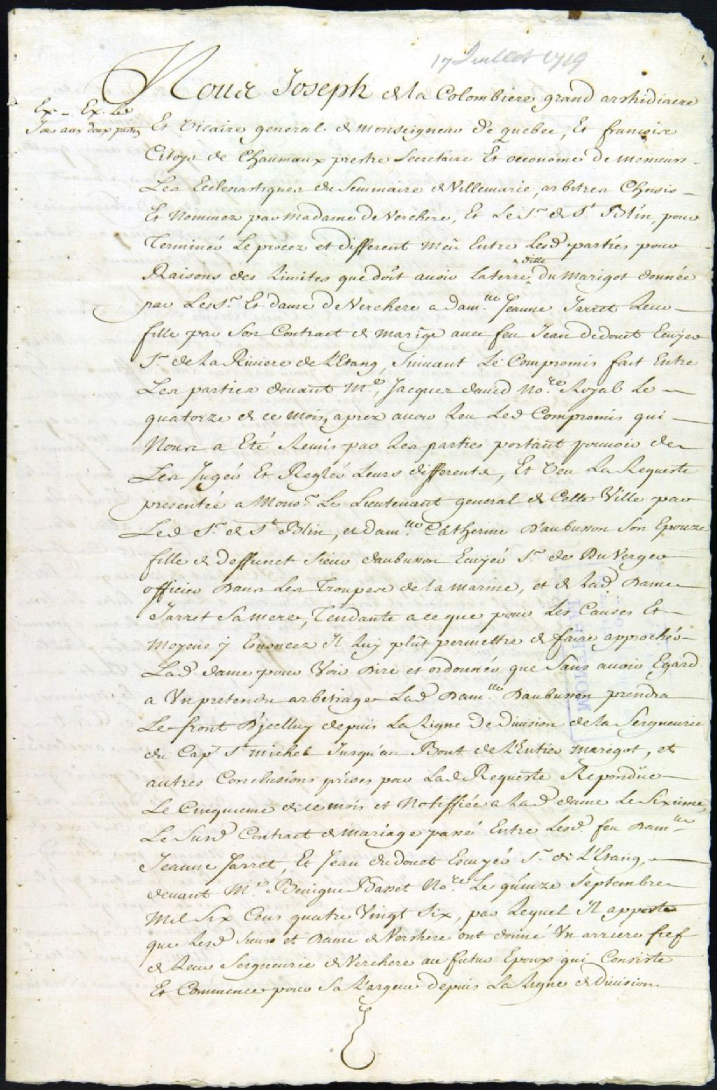 - Ce dossier de matière civile est composé des pièces suivantes : la sentence arbitrale rendue par Joseph Serré de La Colombière, grand archidiacre et vicaire général, et François Citoys de Chaumaux, prêtre, secrétaire et économe des ecclésiastiques du Séminaire, dans une cause entre la dame de Verchères et le sieur de Saint-Blain, au sujet des limites de la terre du Marigot