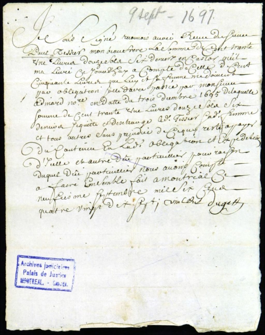 Quittance de Vincent Dugas à son beau-frère Paul Tessier, 9 septembre 1697, Archives nationales à Montréal, Fonds Juridiction royale de Montréal, (06M,TL4,S1,D239).