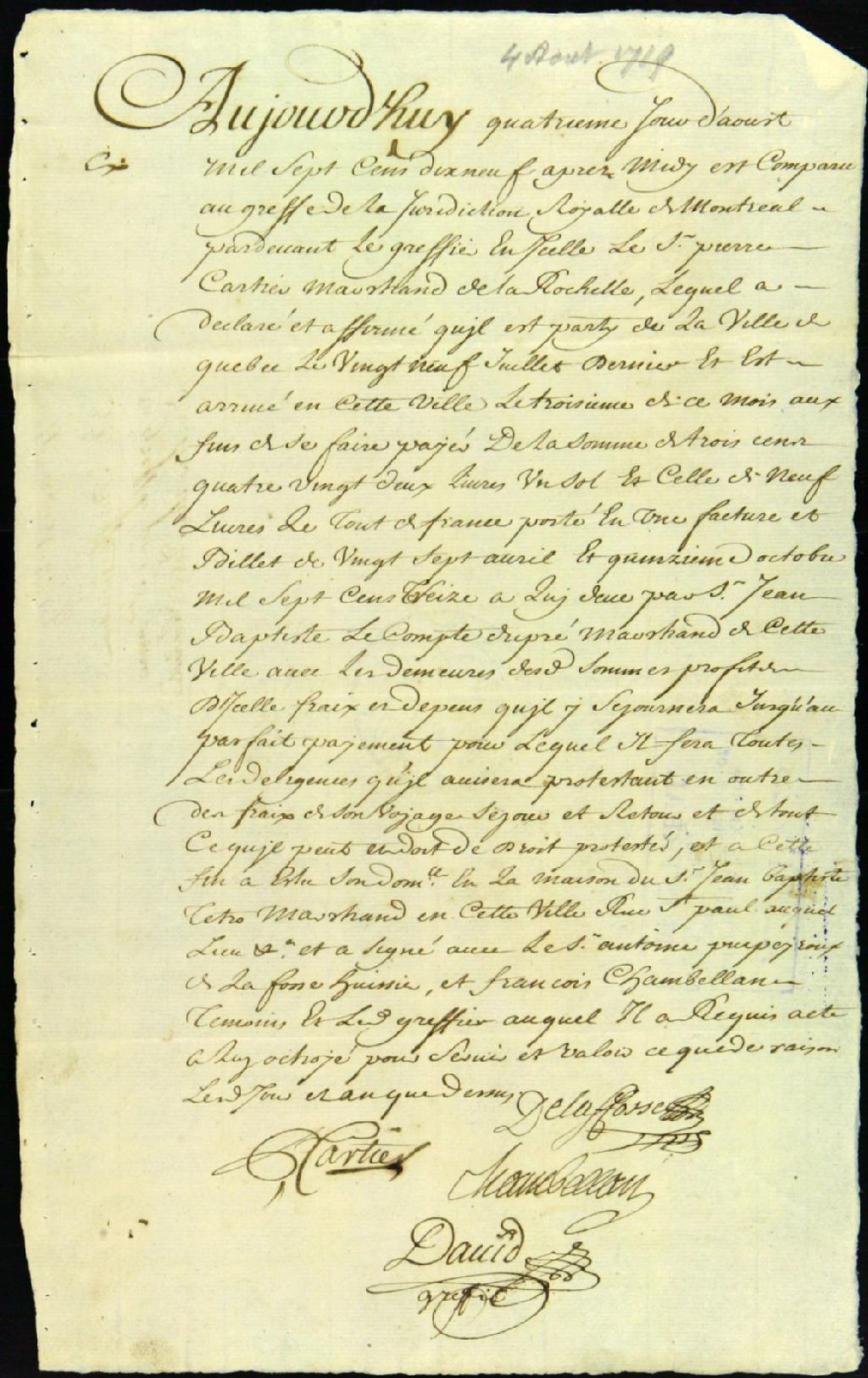 Procès entre Pierre Cartier, marchand, de LaRochelle, demandeur, et Jean-Baptiste Lecomte Dupré, marchand, défendeur, pour le paiement de dettes, 4 août 1719, Archives nationales à Montréal, Fonds Juridiction royale de Montréal, (06M,TL4,S1,D2406).