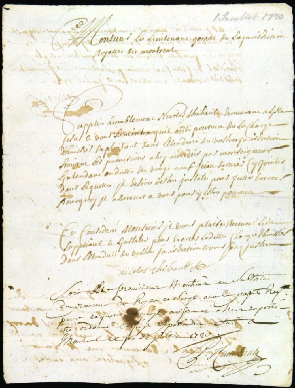 - Ce dossier d'administration civile contient une requête de Thibault, disant être pourvu de la charge d'huissier par l'intendant. Il demande d'être installé comme tel dans la Juridiction royale de Montréal. Le dossier comprend aussi une communication au procureur du roi lequel requiert la tenue d'une information sur la vie et moeurs et religion du requérant ; l'ordre de tenir une information judiciaire ; l'information judiciaire elle-même et sa réception dans la Juridiction de Montréal. Les témoins garants sont Eustache Prévost, tonnelier, 28 ans et Charles Marois, qui demeure chez les pères Jésuites, 27 ans