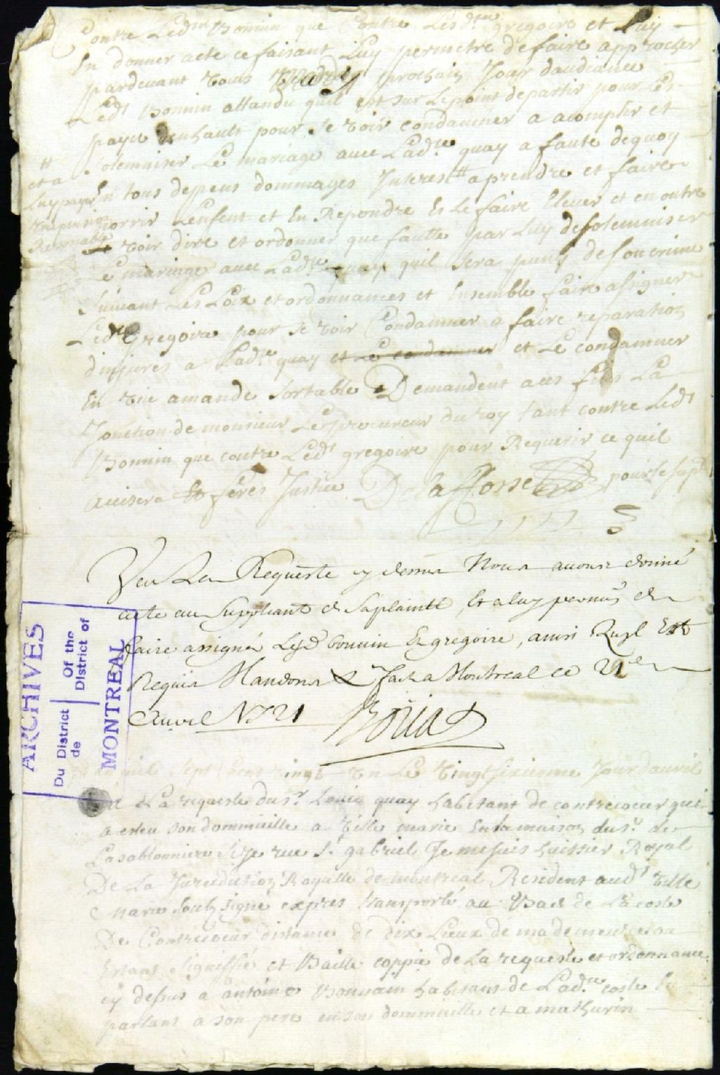 - Ce dossier de matière criminelle est d¿abord composé de la plainte de Louis Quay disant qu¿Antoine Bonin [Bonnin, Bonnain] aurait séduit sa fille, Marie-Louise, sous prétexte de mariage, ce que Bonin renie maintenant que sa fille a accouchée d'un enfant et qu'il refuse de le reconnaître comme étant le sien. Le plaignant prétend que le mariage ne s'est pas matérialisé à cause des médisances de Mathurin Grégoire, lequel a dit à plusieurs personnes qu'il a eu des relations avec Marie-Louise Quay. Il demande à ce que Bonin épouse sa fille ou qu'il paye pour faire élever l'enfant et poursuit Mathurin Grégoire pour injures. Le dossier contient ensuite : la permission de faire assigner Bonin et Grégoire pour être entendus ; la requête de Louis Quay pour l'arrestation des accusés avant leurs départ pour les pays d'en haut ; la transcription d'un jugement ordonnant leur arrestation; l'ordre de mettre l'enfant en pension ; le décret de prise de corps des accusés ; les faits pour servir à l'interrogatoire de Bonin ; et les interrogatoires de Louise Quay et de celui-ci, lequel nie totalement à deux reprises avoir connu intimement la fille Quay et prétend avoir fréquenté le débit de boisson de Louis Quay, sans plus.On retrouve également dans le dossier les pièces suivantes : la communication au procureur du roi qui requiert l'arrestation de Bonin et la comparution de Louise Quay ; l'ordre de ce faire et d'assigner les témoins de la poursuite qui sont Guillaume Larue dit Desplaines, 22 ans, fils d'Étienne, et Joseph Dextra, 26 ans, de Contrecoeur ; l'extrait des registres des prisons sur l'écrou de Bonin ; la signification de l'écrou à l'accusé ; l'information judiciaire ; le récolement du témoignage de la fille Quay ; la requête de Louis Quay pour faire confronter Bonin avec sa fille ; ladite confrontation ; la communication au procureur du roi, lequel requiert un autre interrogatoire de Bonin ; le récolement du témoignage de ce dernier qui présente un certificat du curé de LaFaye ; le certificat de ce dernier au sujet d'une déclaration faite par Mathurin Grégoire devant le sieur de Jordy et de Contrecoeur en date du 16 février 1721 ; le réquisitoire du procureur du roi pour la condamnation de l'accusé ; la liste des frais de justice ; le jugement qui condamne Bonin à prendre et se charger de l'enfant jusqu'à majorité, avec défense de médire et méfaire contre Quay et condamne également Mathurin Grégoire à 400 livres de dommages punitifs ; la comparution de Joseph Circé dit Saint-Michel, habitant de Contrecoeur, chargé de pouvoir d'Antoine Bonin, disant porter sa cause en appel au Conseil Supérieur ; les actes de départ de Bonin et Louis Quay pour Québec ; et l'extrait des registres du Conseil Supérieur pour que le greffier de Montréal lui envoie la grosse du procès