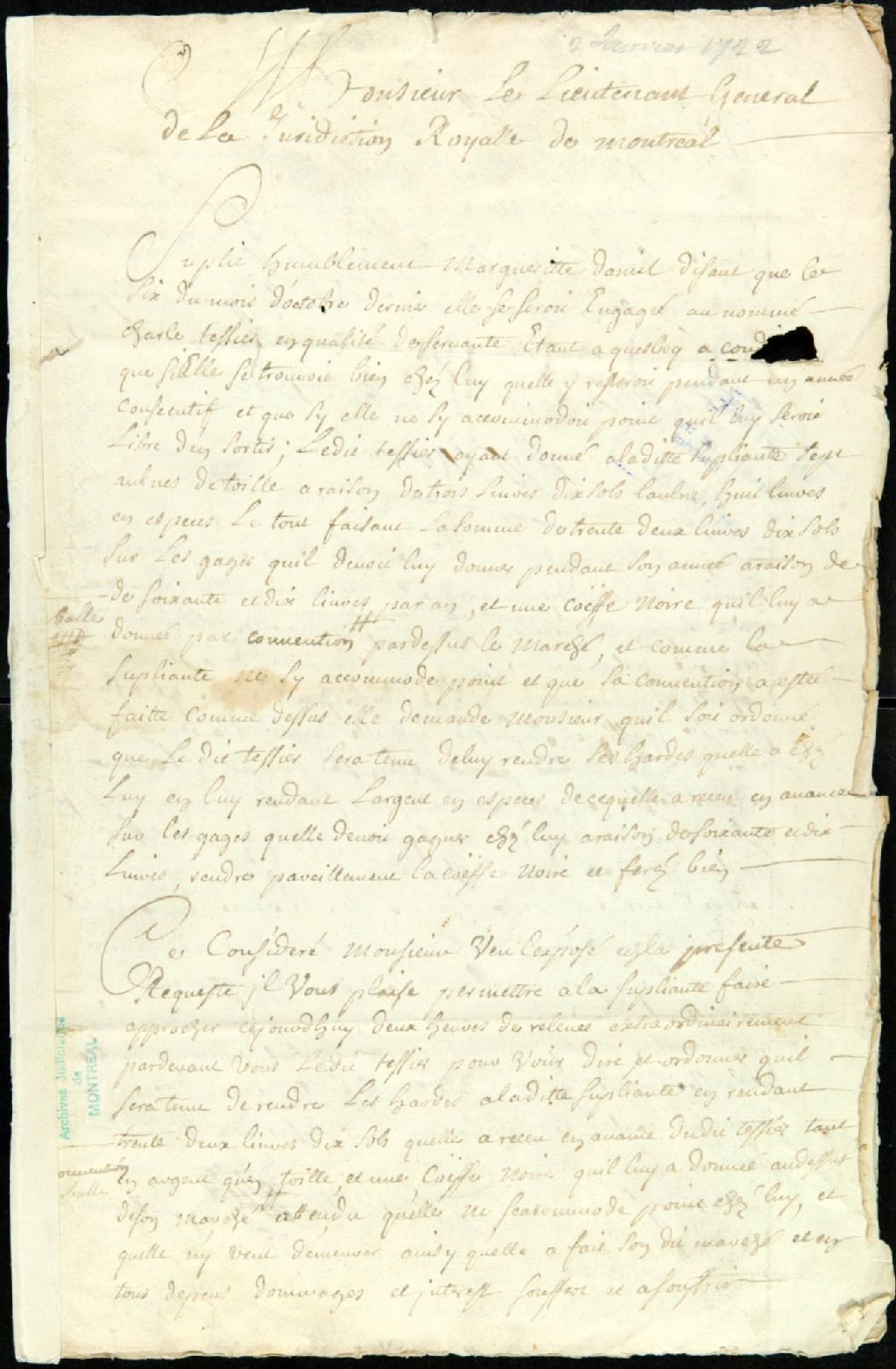 - Ce dossier de matière civile contient la requête de [Marguerite Thomas dit Daniel?] disant qu'elle se serait engagée comme servante chez Charles Tessier à condition de pouvoir retourner chez elle à Québec si elle ne s'y sentait pas bien. Vu qu'elle ne s'y accommode pas, elle demande de faire approcher Tessier pour se voir ordonner à lui remettre ses hardes et faire le compte. On retrouve aussi la permission accordée ; la signification et l'assignation servie à Charles Tessier ; et la procuration de [Marguerite Thomas dit Daniel?] à André Dorien pour comparaître à l'audience et plaider en son nom