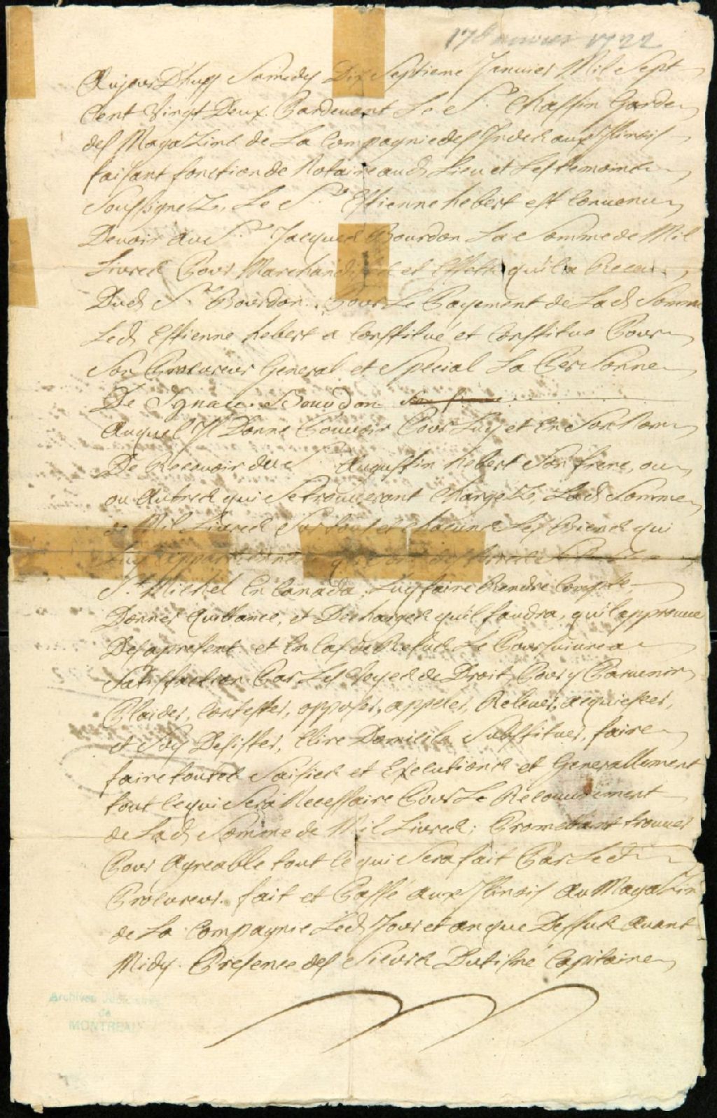 - Ce dossier de matière civile contient l'acte notarié passé aux Illinois par le nommé Chassin, garde magasin de la Compagnie des Indes, faisant les fonctions de notaire royal, pour une reconnaissance de dette faite par Étienne Hébert au profit de Jacques Bourdon pour la somme de 1000 livres pour marchandises et effets. On retrouve aussi le certificat cacheté, signé et scellé au fort de Chartres par Pierre Dugué de Boisbriand à l'effet que Chassin fait les fonctions de notaire royal aux Illinois ; la lettre écrite de Kaskaskia par Jacques Bourdon adressée à son frère Ignace Bourdon à Boucherville lui envoyant une procuration pour 1000 livres à tirer sur les biens de Étienne Hébert ; la transcription scellée d'un jugement du 16 octobre 1722 ; et l'assignation à comparaître à Étienne Hébert, absent, hors du pays, par l'huissier Dudevoir.Les témoins suivant sont mentionnés dans cette affaire : Charles-Claude Dutisné, capitaine et Legardeur [...]