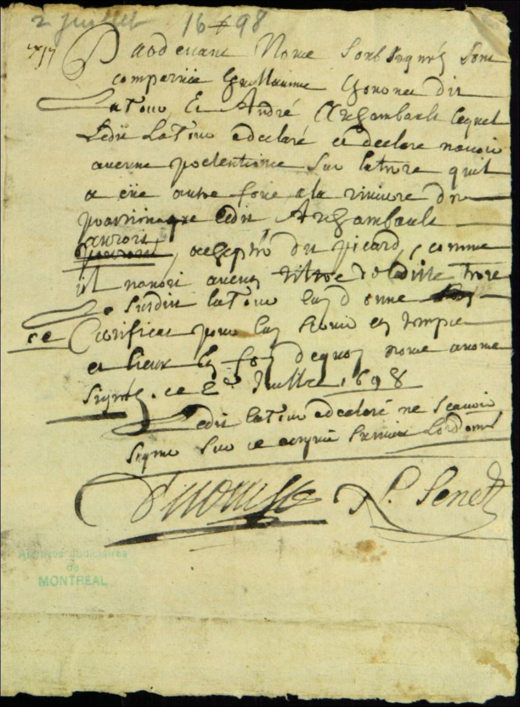 Déclaration de Guillaume Gournay dit Latour affirmant qu'il n'a aucun droit sur une terre de Rivière-des-Prairies ayant appartenue à André Archambault, 2 juillet 1698, Archives nationales à Montréal, Fonds Juridiction royale de Montréal, (06M,TL4,S1,D288).