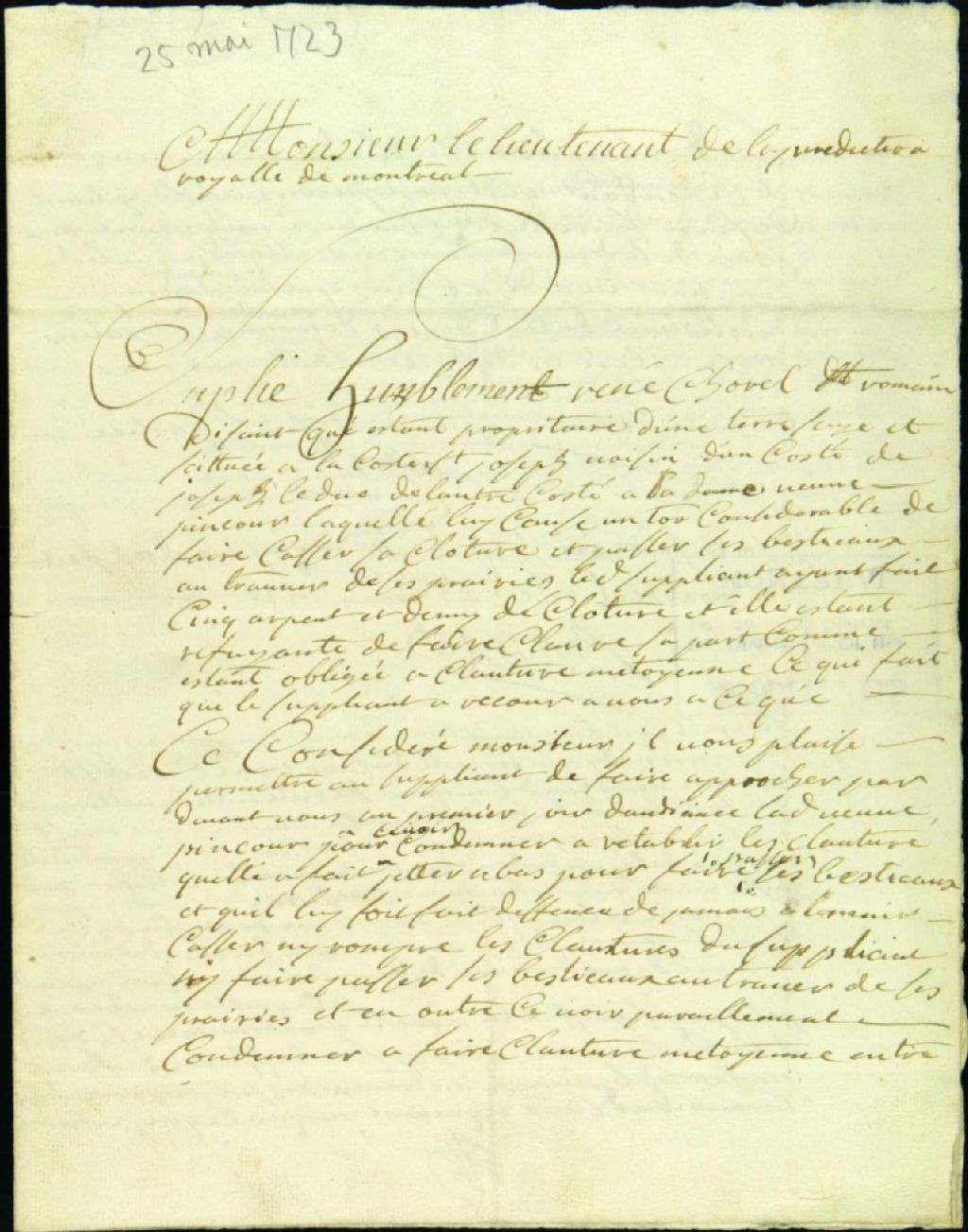 - Ce dossier de matière civile contient la requête de René Chorel pour faire approcher Suzanne Leduc, pour que soit remise en place la clôture mitoyenne qu'elle a fait enlever et lui faire défense de passer avec ses bestiaux sur la terre du demandeur, vu les dommages qu'ils y font. On retrouve aussi les pièces suivantes : la permission de faire assigner les parties pour comparution ; la signification aux parties ; et l'assignation à comparaître à l'audience