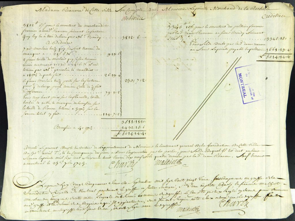 État de compte de madame Réaume envers monsieur Lapointe, marchand de LaRochelle, 23 septembre 1723 - 25 septembre 1723, Archives nationales à Montréal, Fonds Juridiction royale de Montréal, (06M,TL4,S1,D2977).