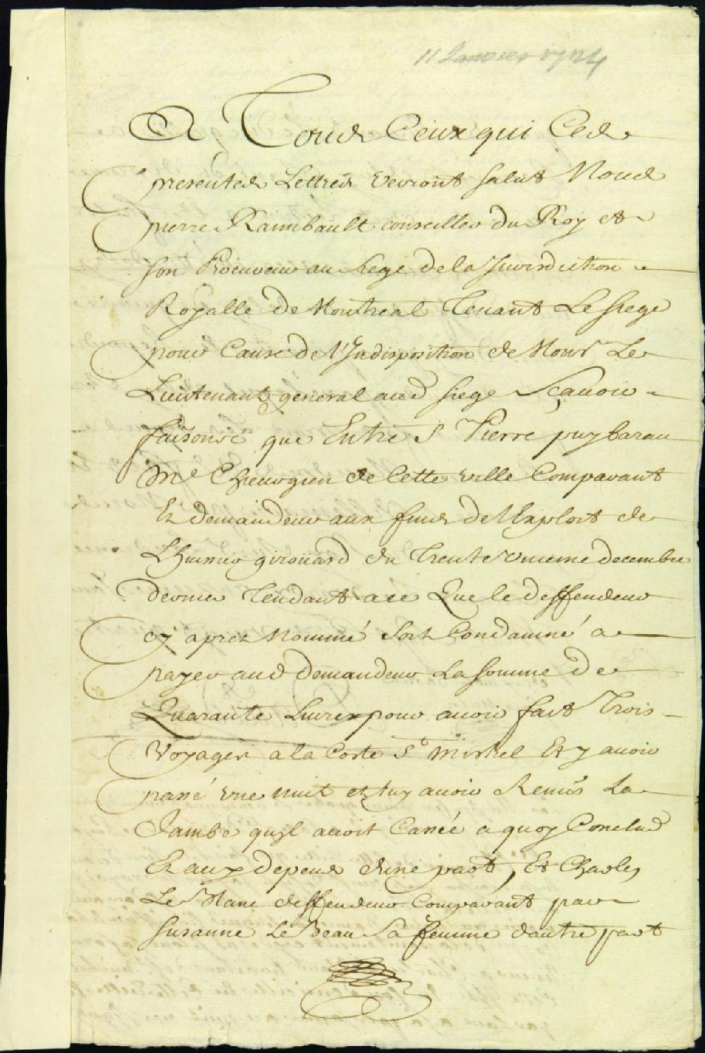 - Procès entre Pierre Puybaro, maître chirurgien, demandeur, et Charles Leblanc, représenté par son épouse Suzanne Bon, de Côte-Saint-Michel, défendeur, pour le paiement de soins médicaux