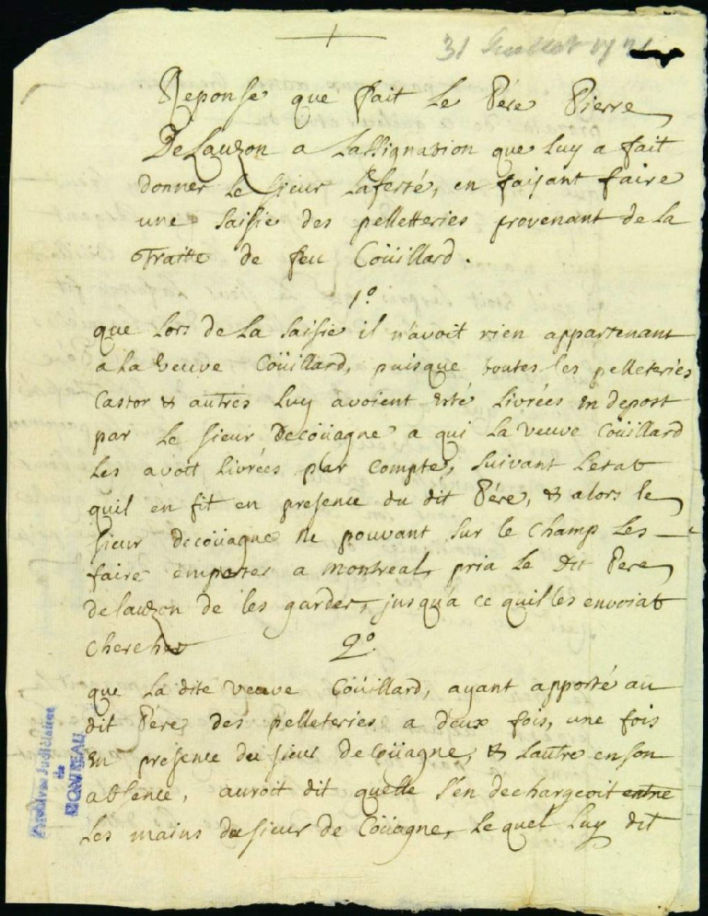 - Ce dossier de matière civile se compose des pièces suivantes : la réponse faite par Anne Brunet, veuve de Pierre Couillard, à l'assignation et la saisie faite par François Lepailleur, des pelleteries provenant de la traite du défunt Couillard ; la réponse faite par le père de Lauzon à l'assignation et à la saisie faite par François Lepailleur de Laferté, fils de Michel, des pelleteries provenant de la traite de feu Pierre Couillard ; la transcription d'une sentence d'appointement ordonnant la comparution du père de Lauzon, dans une demande de saisie faite par François Lepailleur sur les pelleteries de la succession de feu Pierre Couillard ; et la transcription d'une déclaration d'Anne Brunet concernant une poursuite intentée par la veuve Biron et son fils