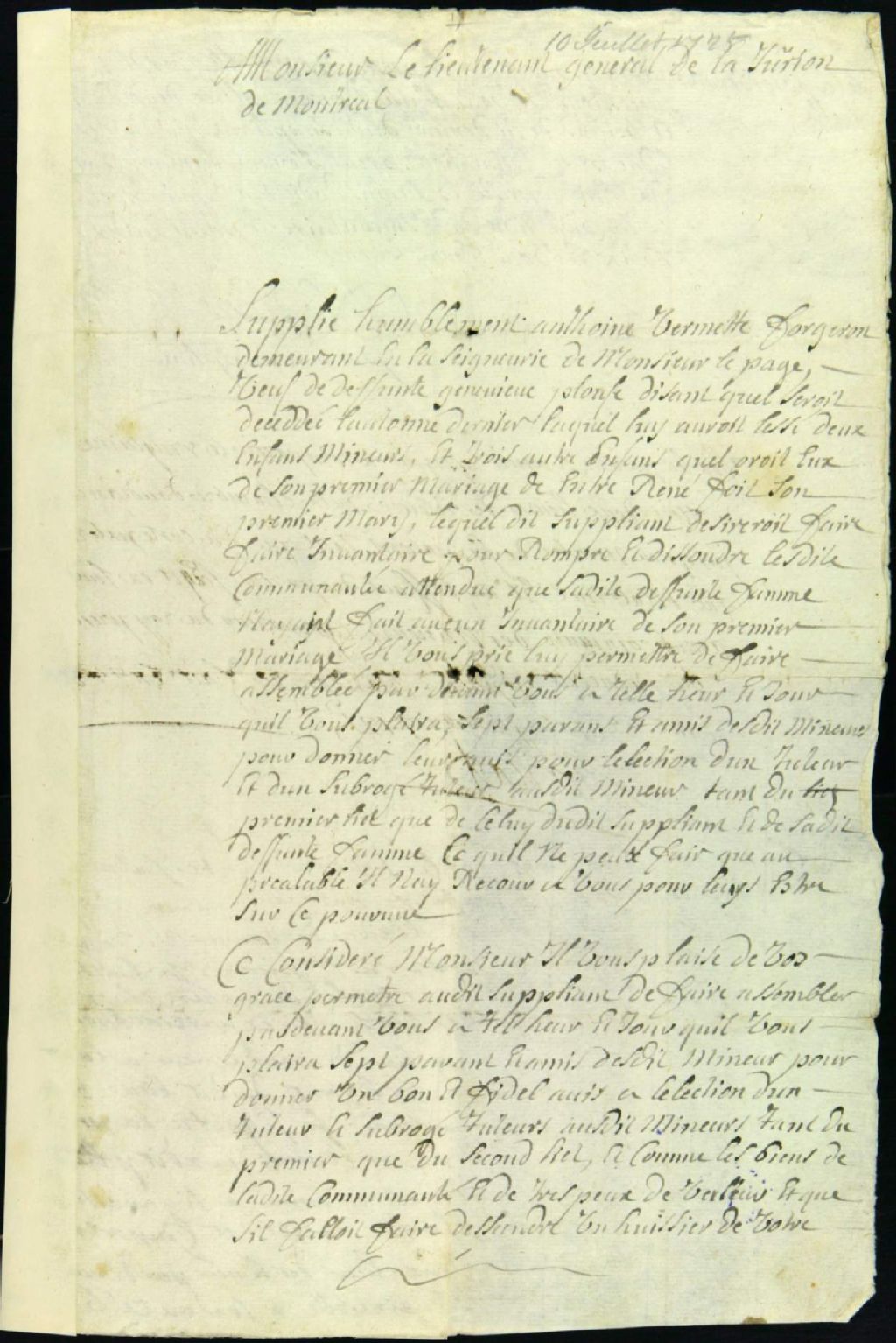 - Ce dossier d'administration judiciaire contient la requête d'Antoine Vermet, veuf de Geneviève Plouf, pour tenir deux réunions de parents et amis en vue de faire élire un tuteur à ses enfants mineurs et un autre à ceux issus d'un premier lit de son épouse avec René Fouin ; la permission et la signification à partie par l'huissier ; la requête d'Antoine Vermet pour faire élire un nouveau tuteur et la communication au procureur du roi ; et la clôture d'inventaire des biens de Vermet et Geneviève Plouf