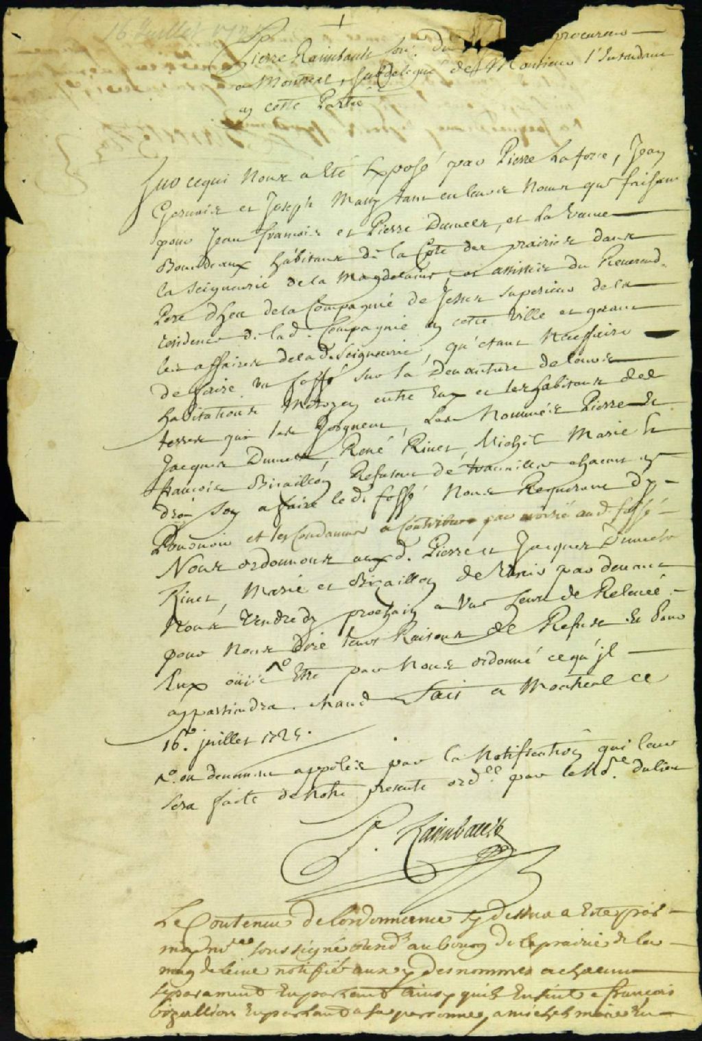 Procès entre [Pierre Pépin dit Laforce?], Jean Gervaise, [Joseph Massy?], la veuve Bourdeau, Jean-François et Pierre Demers, demandeurs, et René Rivet, Michel Marie, François Bisaillon, Pierre et Jacques Demers, défendeurs, à propos d'un fossé