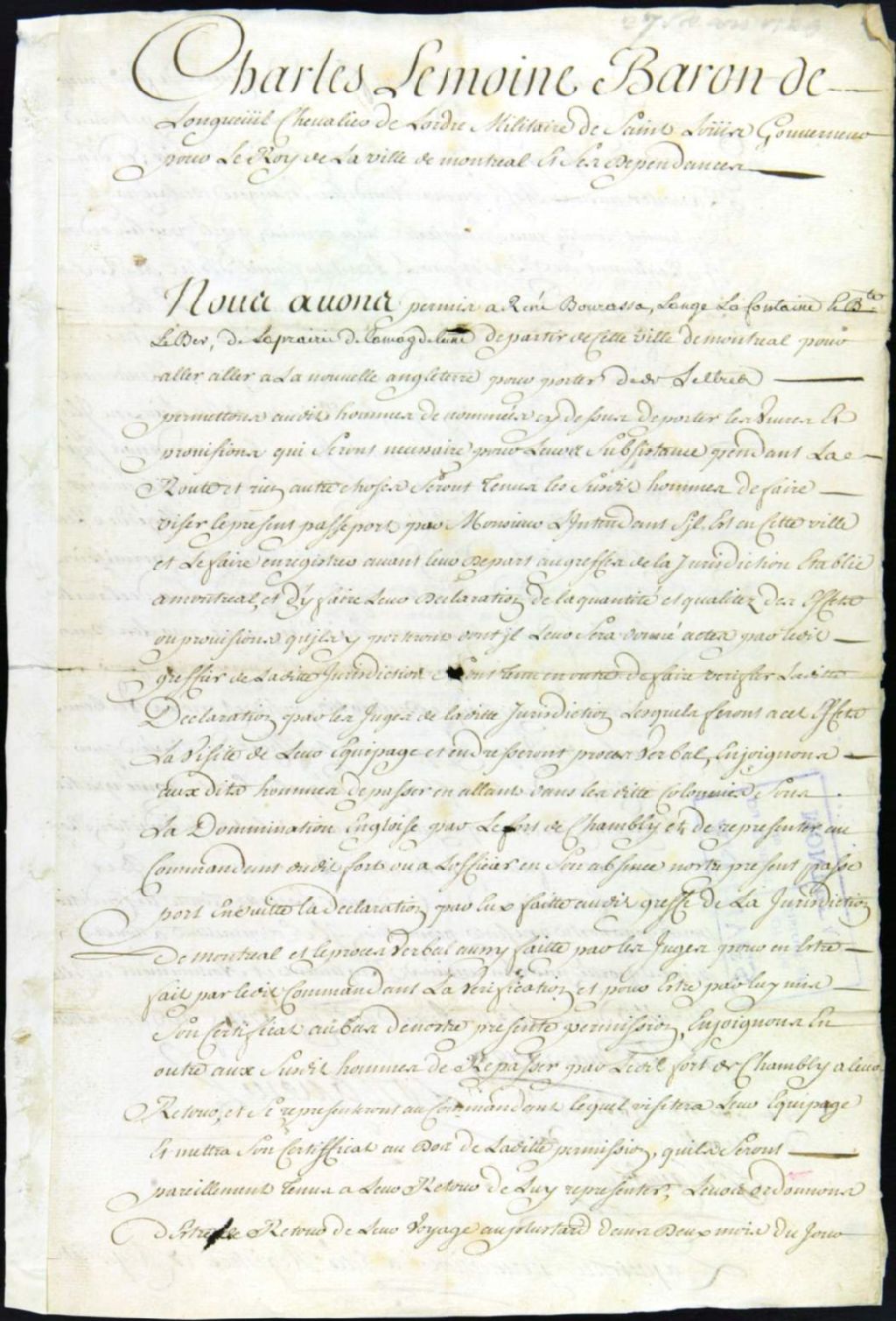 - Ce dossier d'administration civile contient les pièces suivantes : le permis signé par Charles Lemoine, baron de Longueuil, autorisant Bourassa et ses hommes nommés [Ange?] Cusson dit Lafontaine et François Leber de Laprairie, de partir pour la Nouvelle-Angleterre pour y porter des lettres, enregistré au greffe le 27 mars 1729 et vu par le commandant de Chambly, le premier avril 1729, au départ et revu au retour de voyage le 7 mai 1729. Le dossier contient aussi l'original et la transcription de la déclaration de Bourassa au greffe au sujet de son départ ; le procès-verbal d'inspection du canot de Bourassa ancré en face de Laprairie, le chargement est trouvé conforme aux règlements ; et les déclarations au greffe par Bourassa, Leber et Lafontaine relativement à leur voyage à Orange. Ils disent y avoir vu « un français lequel y aurait conduit la Mlle Rolings, l'automne dernier »