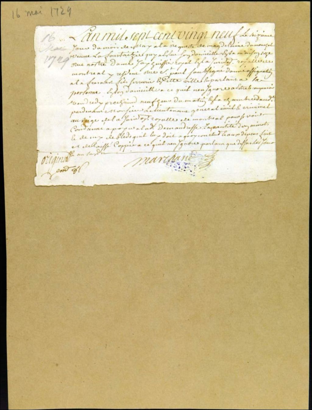 Madeleine Dumouchel, veuve de Maurice dit Lafantaisie, demanderesse, et Lafresnaye fils, serrurier, défendeur, pour le paiement de dettes, 16 mai 1729, Archives nationales à Montréal, Fonds Juridiction royale de Montréal, (06M,TL4,S1,D3578).