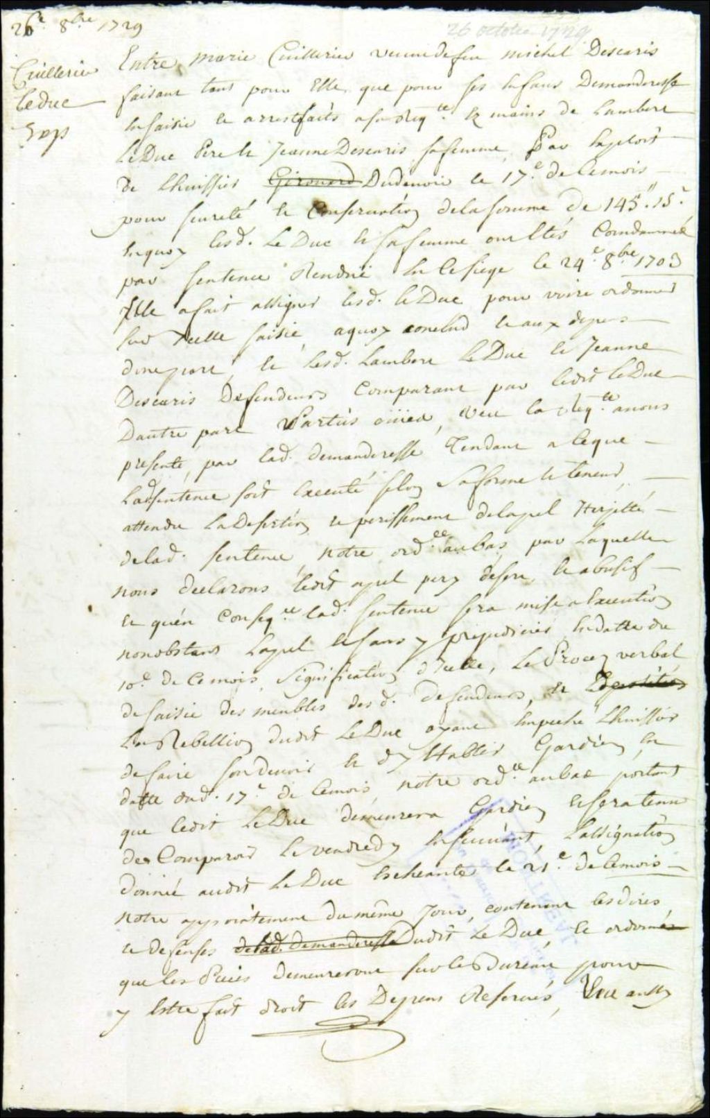 Procès entre Marie Cuillerier, veuve de Michel Descaries, demanderesse, et Lambert Leduc, époux de Jeanne Descaries, pour dettes, 26 octobre 1729 - 9 décembre 1729, Archives nationales à Montréal, Fonds Juridiction royale de Montréal, (06M,TL4,S1,D3670).