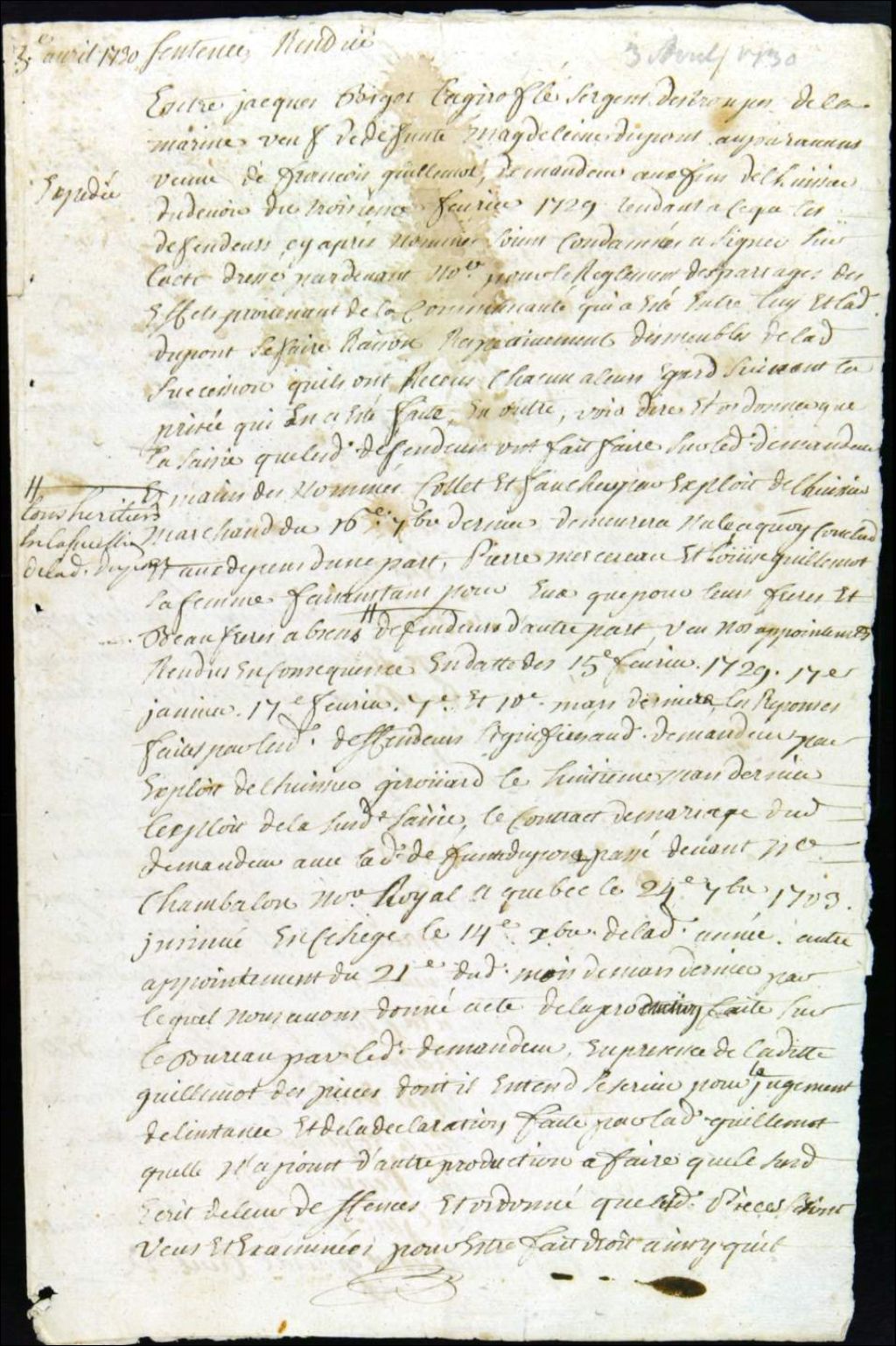 - Ce dossier de matière civile est composé des pièces suivantes : la sentence dans une poursuite intentée par Jacques Bigot dit Lagiroflée contre Pierre Mercereau concernant le partage des biens de François Guillemot et Madeleine Dupont ; l'acte de départ de Bigot; la sentence permettant à Louise Guillemot, épouse Mercereau, de présenter François Poulin, caution judiciaire, pour la saisie des pelleteries de Jean Faucher, des mains de Claude Collet, au greffe de la juridiction ; le dictum de sentence pour le règlement des comptes de la succession de François Guillemot ; la requête de Mercereau pour faire approcher Bigot et Collet pour présenter Jean-Baptiste Hervieux, caution judiciaire ; la réception de Jean-Baptiste Hervieux, caution judiciaire pour Mercereau ; et la soumission de caution
