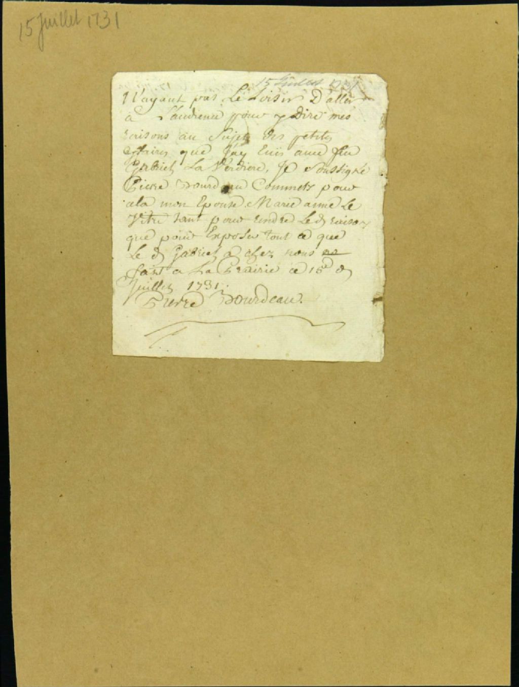 - Ce dossier de matière civile est composé des pièces suivantes : la procuration de Pierre Bourdeau, en faveur de Anne Levitre, son épouse, pour le représenter dans une poursuite intentée par les héritiers de Gabriel Laverdière contre la saisie du demandeur, pour le paiement d'une dette ; le jugement déboutant Charles Demers représentant les héritiers de Gabriel Laverdière, et ordonnant que les effets en mains de Bourdeau soient vendus pour payer la dette du défunt ; la sentence renvoyant les parties à l'exécution d'un acte de transaction fait entre eux le 21 août 1731. Jacques Charland est mentionné comme témoin comparant