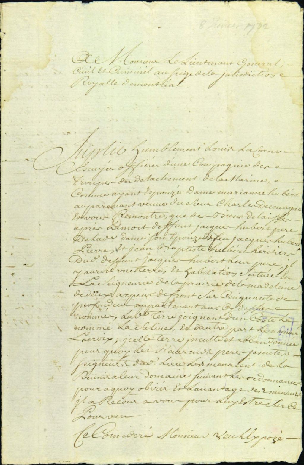 - Ce dossier d'administration judiciaire est composé des pièces suivantes : la requête de Louis de Lacorne, écuyer, époux de Marie-Anne Hubert dit Lacroix, veuve de Jacques-Charles de Couagne, pour faire assemblée de parents et d'amis en vue de faire vendre par licitation une terre inculte et abandonnée située à Laprairie appartenant à la succession de Jacques Hubert dit Lacroix ; la permission accordée ; la délibérations pour la vente par licitation et la permission ; la mise à prix et l'enchère au greffe par Louis de Lacorne à 600 livres ; et la transcription d'une sentence d'adjudication de la terre audit Lacorne pour 700 livres