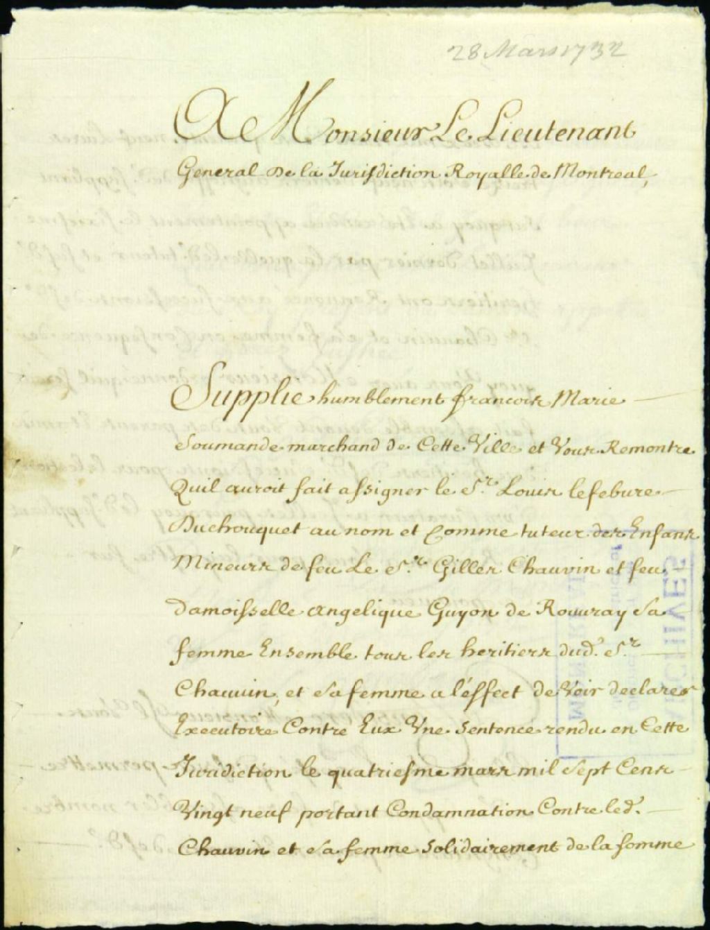 - Ce dossier de matière civile est composé des pièces suivantes : la requête de François-Marie Soumande, marchand, pour faire assigner les parents et les amis des défunts Gilles Chauvin et son épouse Anne Guyon de Rouvray, pour faire nommer un curateur à la succession vacante, tel que suivant la décision de Louis Lefebvre sieur Duchouquet, tuteur des enfants mineurs de Papin, lequel a renoncé à la succession; la permission de faire assemblée; les oppositions de Céleste Petit, épouse et procuratrice de Louis Lefebvre Duchouquet pour 74 livres de frais de justice, Thérèse Catin, procuratrice de son mari, Simon Réaume, Étienne Volant, sieur de Radisson, subrogé tuteur des enfants de Gilles Chauvin, Jacques Gadois dit Mauger et Ignace Gamelin; la sentence d'adjudication de la terre à Pierre Hubert dit Lacroix et de la maison à René Bissonnet dit LaFavry; la sentence d'ordre et de distribution des deniers provenant de la vente par décret; la présentation d'un billet dû par la succession Chauvin par François Lepailleur, curateur; et la caution présentée par Soumande pour couvrir le billet présenté par Lepailleur