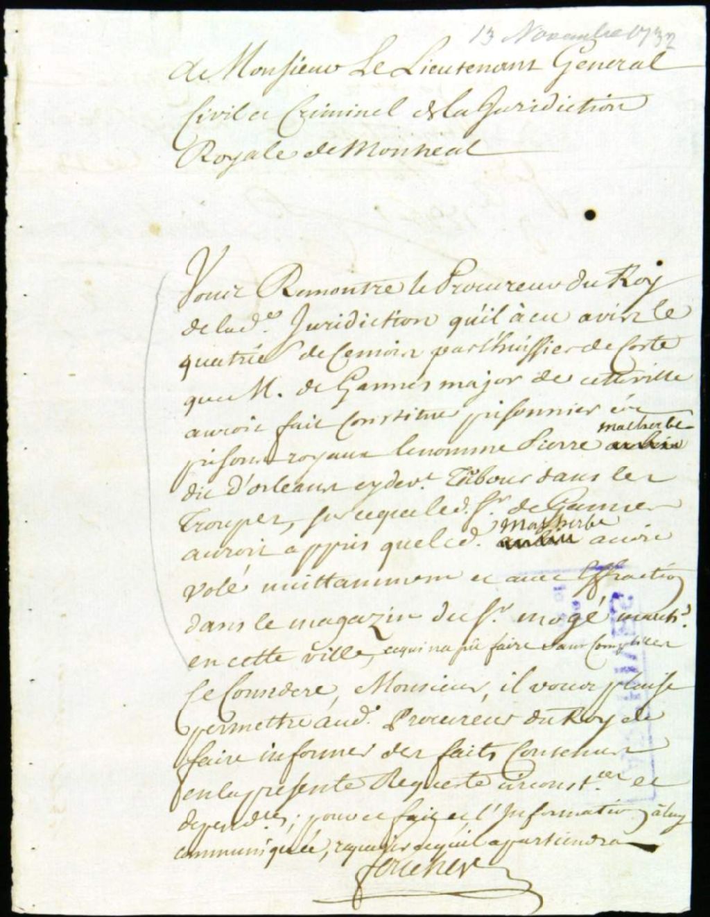 Procès contre Pierre Malherbe dit Orléans, ancien soldat de la Compagnie de Senneville, accusé de vol par effraction, 13 novembre 1732 - 15 novembre 1732, Archives nationales à Montréal, Fonds Juridiction royale de Montréal, (06M,TL4,S1,D3979).