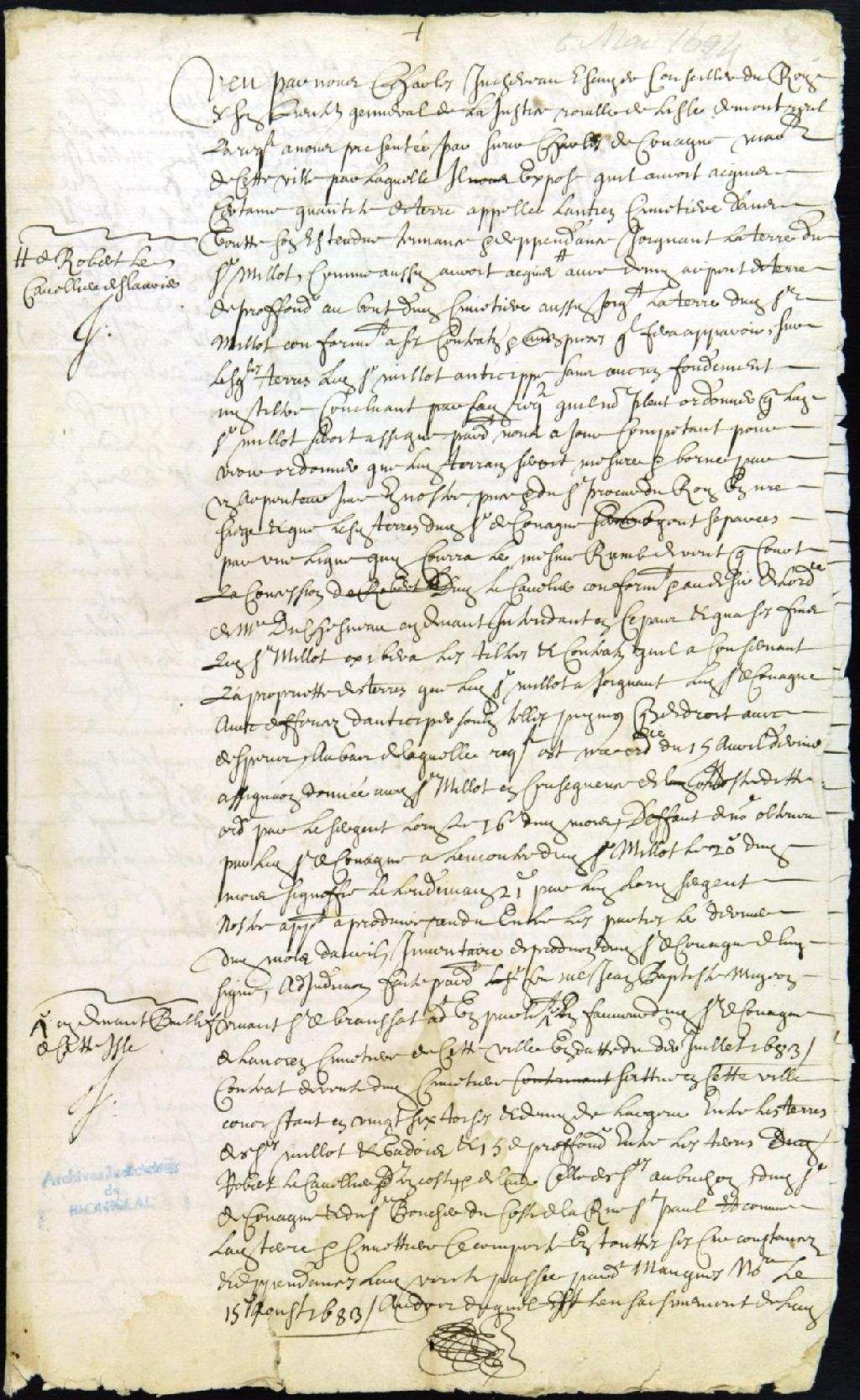 Procès entre Charles de Couagne, marchand, demandeur, et Jean Milot, marchand, défendeur, au sujet des limites de leurs terres respectives, situées au lieu dit " l'ancien cimetière "