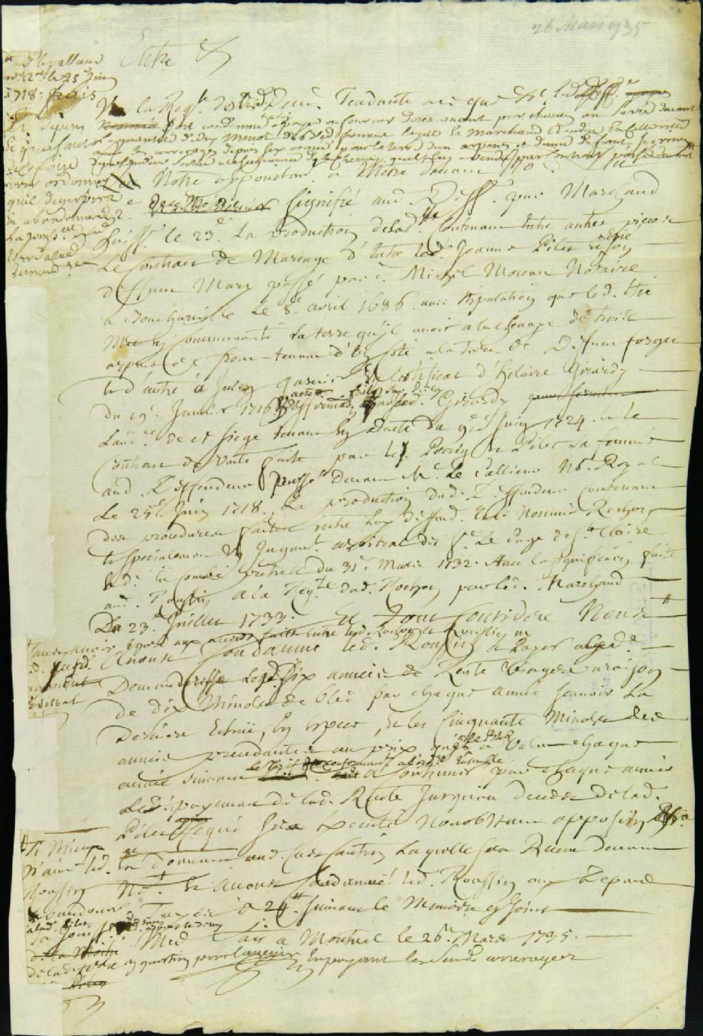- Ce dossier de matière civile se compose de la pièce suivante : le brouillon d'une sentence qui condamne Roussin à payer à la demanderesse dix minots de blé par année pour chacune des six dernières années, représentant la rente viagère d'une terre, tel que suivant un marché passé devant Lepailleur le 25 juin 1718
