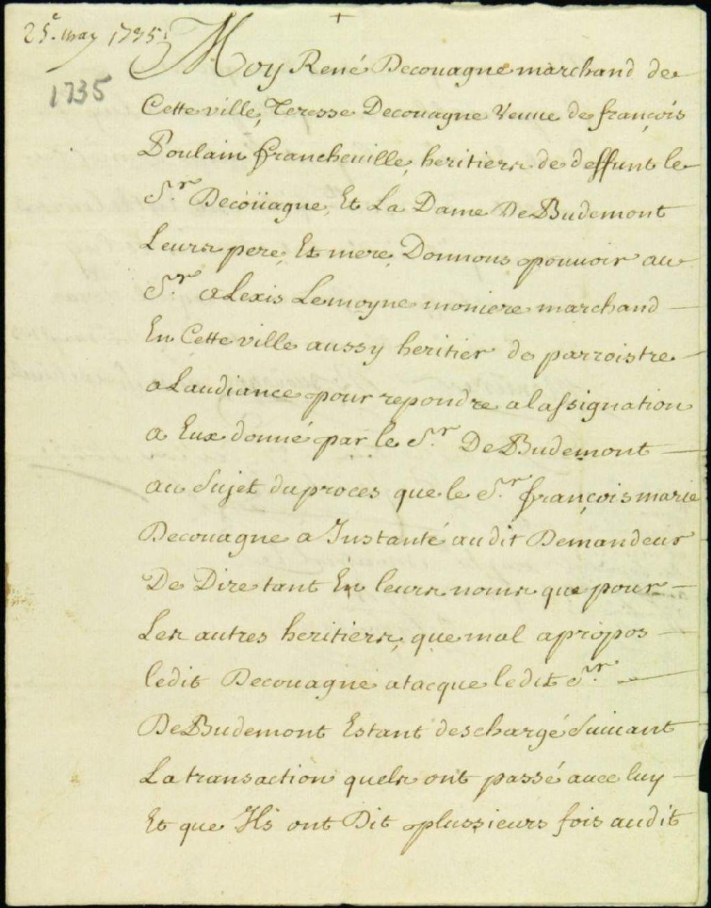 - Procès entre François-Marie de Couagne, demandeur, et Pierre Derivon, sieur de Budemont, veuf de Marie Godé, René de Couagne, marchand, et Thérèse de Couagne, veuve de Poulin de Francheville, défendeurs, au sujet d'un règlement de comptes