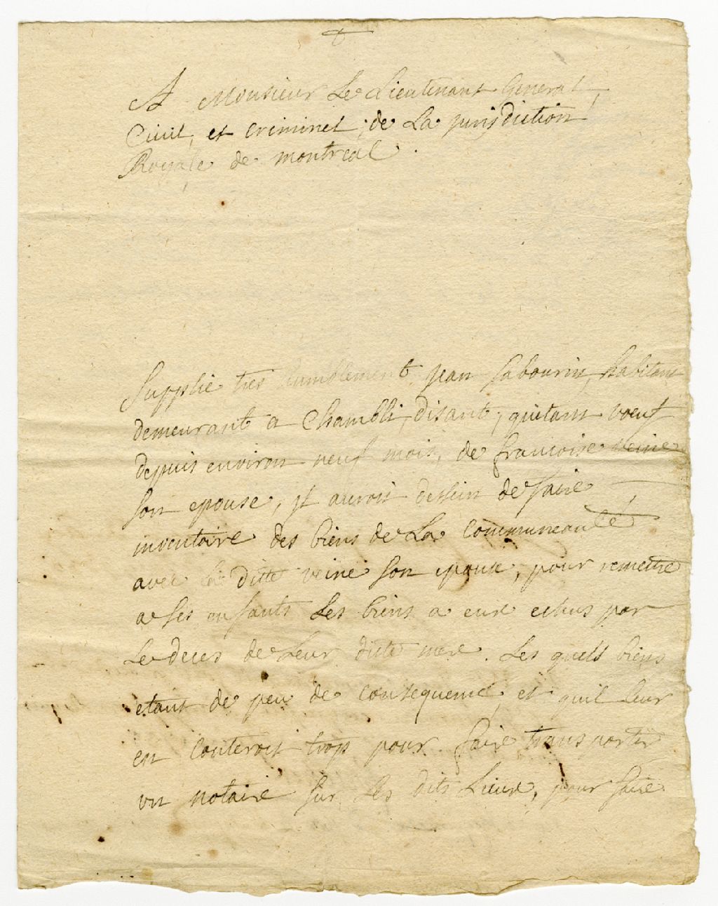 Requête pour faire l'inventaire sous seing-privé des biens de la succession et de la communauté de Jean Sabourin dit Chaunière et de feu Françoise Venne. – 1 juin 1735 - 3 novembre 1735, 1 juin 1735 - 3 novembre 1735, Archives nationales à Montréal, Fonds Juridiction royale de Montréal, (06M,TL4,S1,D4244A).