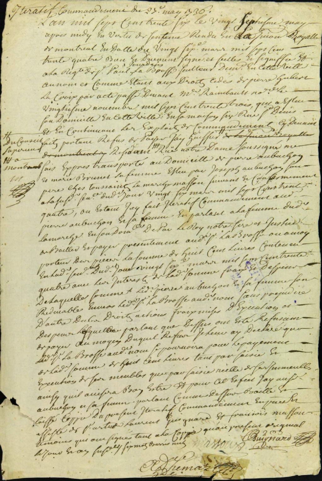 - Ce dossier de matière civile se compose des pièces suivantes : le rapport par l'huissier J.B. Adhémar du Conseil Supérieur d'un commandement itératif à Pierre Aubuchon et à sa femme Marie Brunet pour le paiement de la somme de 800 livres pour une obligation passée devant le notaire Raimbault, à la requête de Paul Jourdain dit Labrosse, sculpteur et menuisier, comme ayant les droits cédés de Pierre Hubert dit Lacroix; le procès-verbal de saisie réelle d'une terre de 3 arpents par 40 à la côte Saint-Sulpice ; les procès-verbaux de la publication au panonceau et de la première criée ; la sentence d'appointement de François Lepailleur et de Comparet pour faire la certification des criées ; la sentence de certification des criées " bonne et valable "; le procès-verbal de la mise à prix par Louis Goulet, de L'Assomption, pour la somme de 1000 livres ; la sentence de congé d'adjudication et les significations ; la sentence de remise d'adjudication ; les oppositions au greffe par Mathieu Falcoz, procureur du séminaire, J.B. Ménard, époux de Marie Cardinal, et J. Aubuchon, père de Pierre Aubuchon ; la procuration de Paul Labrosse à l'huissier Decoste pour le représenter à l'audience ; l'extrait des registres de l'ordonnance de production des pièces aux opposants ; et la sentence d'ordre