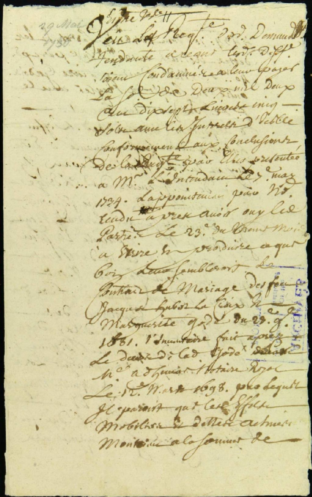 - Ce dossier de matière civile se compose des pièces suivantes : une sentence d'appointement dans une cause entre Marie Cardinal, Françoise Cardinal et Pierre Lériger de LaPlante, concernant la succession de Jacques Hubert dit Lacroix, époux de Marguerite Godé ; le dictum de sentence qui condamne Lériger à payer aux demanderesses 1488 livres, 14 sols et 7 deniers provenant des biens de la succession ; et le mémoire des frais