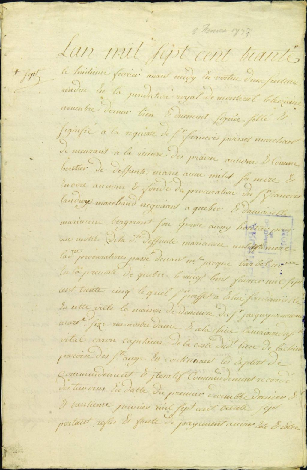 - Ce dossier de matière civile est composé des pièces suivantes : la requête en saisie réelle du fief Milot, à Lachine, par François Poisset, agissant pour lui et François Landron contre Louis Lefebvre Duchouquet, en tant que curateur de la succession vacante de Charles Milot et de Marie Pothier, tel que dicté par la sentence du 13 novembre 1736 ; les oppositions enregistrés au greffe par Louis-Claude Danré de Blanzy, procureur de J.B. Mallet, époux de Pothier, afin de distraire de la saisie la moitié du fief Milot et de Jacques Milot sur les deniers qui proviendront de la vente par décret ; la requête de Poisset, poursuivant criée du fief Milot, pour faire comparaître les arbitres arpenteurs qui procéderont au tracé de la ligne de séparation ; la permission de faire approcher les arpenteurs ; la prestation des serments des arpenteurs J.B. Lefebvre dit Angers et Toussaint Beaudry ; la sentence de saisie " bonne et valable " par J.F. Maillot ; et la sentence de congé d'adjudication