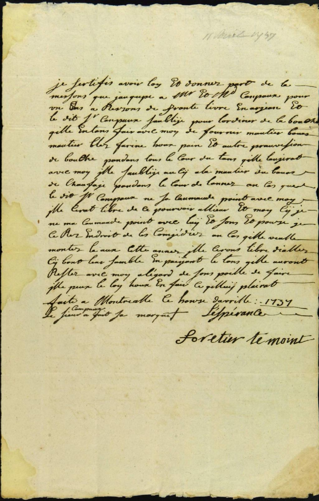 - Ce dossier de matière civile est composé des pièces suivantes : le marché rédigé sous seing privé pour la location d'une maison entre Antoine Tellier dit Lespérance, propriétaire et Michel Campeau et sa femme ; la requête d' Antoine Tellier pour l'expulsion de son locataire Campeau ; la permission du lieutenant général pour faire assigner Campeau à comparaître ; l'assignation faite à Campeau, absent, en laissant un écrit sur sa demeure ; le jugement par défaut contre Campeau non comparant ; et la signification au moyen d'une affiche sur la maison