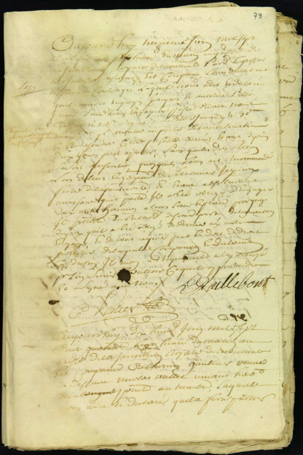 Ce document de matière civile est composé de la déclaration faite au greffe de Montréal par Louis d'Ailleboust disant que ses deux engagés Jacques et Antoine Pilon, frères, ne se sont pas présentés pour monter à Michillimakinac tel que suivant le contrat passé chez le notaire Porlier à cet effet. Il proteste des frais supplémentaires