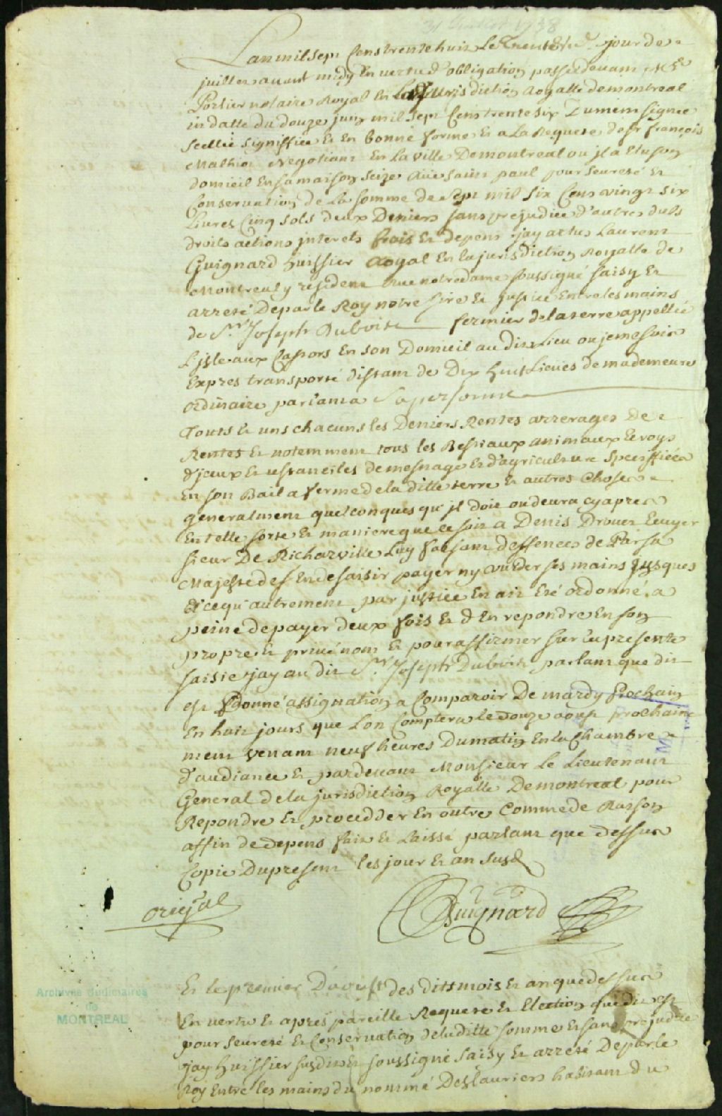 Procès entre François Maillot, époux de Charlotte Gamelin, négociant, demandeur, et Denis Drouet, sieur de Richardville, défendeur, pour le paiement d'une obligation, 31 juillet 1738 - 11 mars 1740, Archives nationales à Montréal, Fonds Juridiction royale de Montréal, (06M,TL4,S1,D4575).