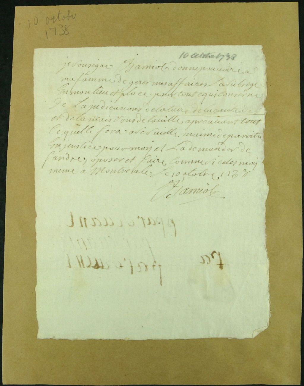 Procuration de [B.?] Amiot à sa femme pour gérer ses affaires et le représenter lors de l'adjudication d'une terre et maison de ville, 10 octobre 1738, Archives nationales à Montréal, Fonds Juridiction royale de Montréal, (06M,TL4,S1,D4596).
