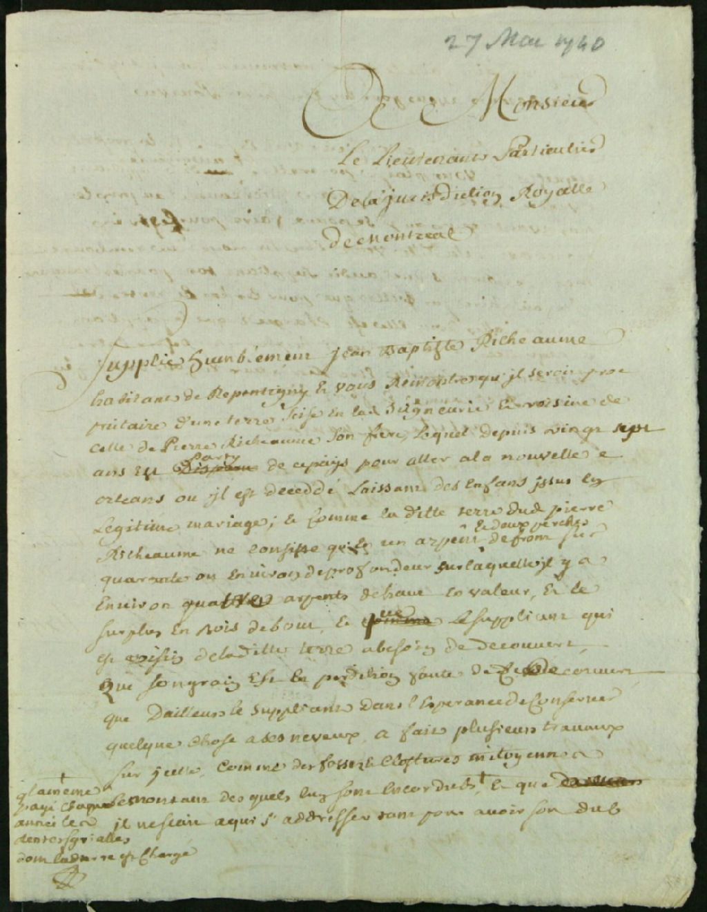 Tutelle des enfants mineurs de Pierre Richaume, décédé à la Nouvelle-Orléans, et Jeanne Françoise Maroy, 27 mai 1740, Archives nationales à Montréal, Fonds Juridiction royale de Montréal, (06M,TL4,S1,D4710).