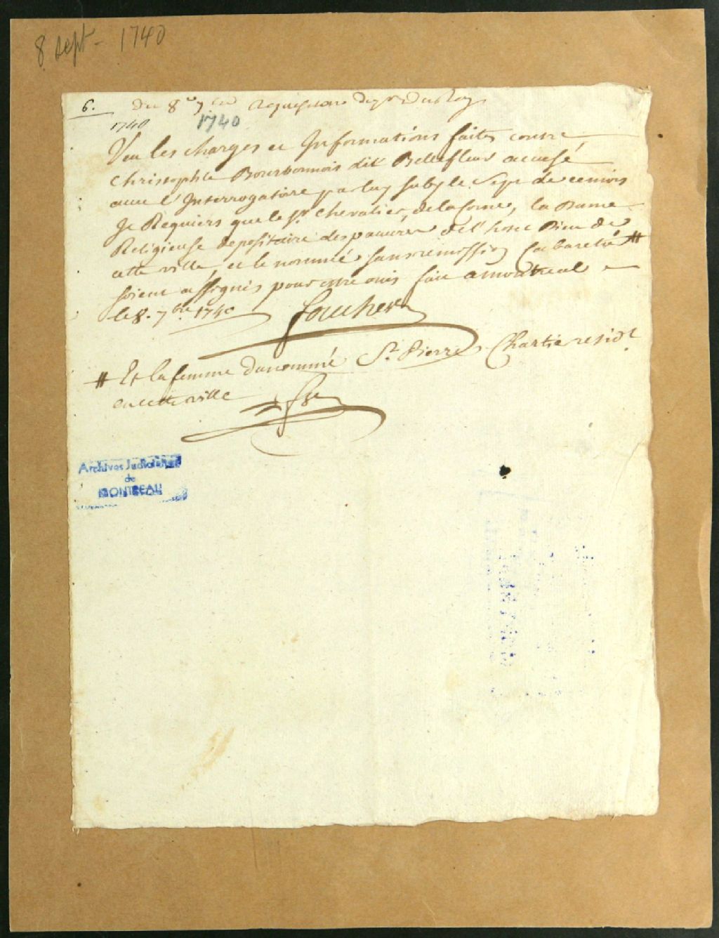 Ce dossier de matière criminelle est composé des pièces suivantes : le réquisitoire pour faire assigner les témoins du procureur du roi contre le nommé Christophe Bourbonnais, âgé de 28 ans, accusé d'avoir volé une importante somme d'argent dans une cassette appartenant aux religieuses de l'Hôpital des pauvres, alors qu'il y était en convalescence ; l'ordre pour faire assigner les témoins ; la procuration des Hospitalières à Danré de Blanzy pour se présenter pour elles, " ne pouvant sortir " ; la requête pour la prise de corps de l'accusé ; l'ordonnance pour ce faire ; le décret scellé de prise de corps ; le rapport de signification ; la demande pour que de Lafontaine se rende à l'Hôtel-Dieu prendre la déposition des religieuses, lesquelles ne peuvent sortir ; l'ordre qui s¿en suit ; la sixième et dernière page du témoignage de la s¿ur Louise Piot de L'Angloiserie, procuratrice des pauvres ; le petit billet anonyme, remis par les religieuses, disant que Bellefleur n'est pas coupable et que le coupable a passé par la fenêtre pour effectuer le délit ; l'interrogatoire de Christophe Bourbonnais, en présence du chevalier de St-Ours, observateur militaire. L'accusé mentionne être en prison depuis le 20 août en attente de procès. Il clame son innocence et prétend ne pas s'être levé de la nuit alors que plusieurs autres patients disent l'avoir vu se lever au cours de la nuit durant laquelle le vol a été commis.Le dossier contient également : la requête du procureur du roi pour faire entendre ses témoins par addition d'information ; l'addition d'information judiciaire, l'information antérieure étant manquante ; la requête pour le récolement des témoignages et la confrontations des témoins avec l'accusé ; les ordonnances pour le récolement des témoignages, de l'interrogatoire de l'accusé et pour faire assigner les témoins pour la confrontation avec celui-ci ; l'ordre d'assigner les témoins ; le procès-verbal de récolement des témoignages ; les confrontations de chacun des témoins avec l'accusé ; les conclusions pour l'élargissement ce dernier, sujet à caution juratoire ; l'avis de Guillet de Chaumont, assesseur, pour le renvoi de l'accusé ; l'opinion de Jean-Baptiste Adhémar, lui aussi assesseur, pour appliquer la question à Bourbonnais ; l¿interrogatoire de ce dernier sur la sellette ; et la sentence le relaxant, sujet à caution juratoire avec ordre de tenir plus ample information sur le sujet, le cas échéant.Plusieurs témoins sont mentionnés dans ces documents : Jacques Mazurais dit St-Jacques, 56 ans, soldat de la Compagnie Verchères ; Jean Langlois, 60 ans, contremaître à la ferme des pauvres ; Joachim Primeau, 16 ans, malade à l'Hôpital ; Jean Milton dit Flavigny, ancien soldat de LaPerrière, infirmier à l'Hôtel-Dieu ; Mirault dit Labouteille, épouse de Pierre Rousset, voiturier ; Louis de Lacorne ; Anne-Françoise Leduc, s¿ur St-Joseph, supérieure ; et André Baudin dit Sansrémission, cabaretier. Madeleine Guillet, s¿ur à l'Hôtel-Dieu, est signataire d¿un des documents mentionnés ci-dessus
