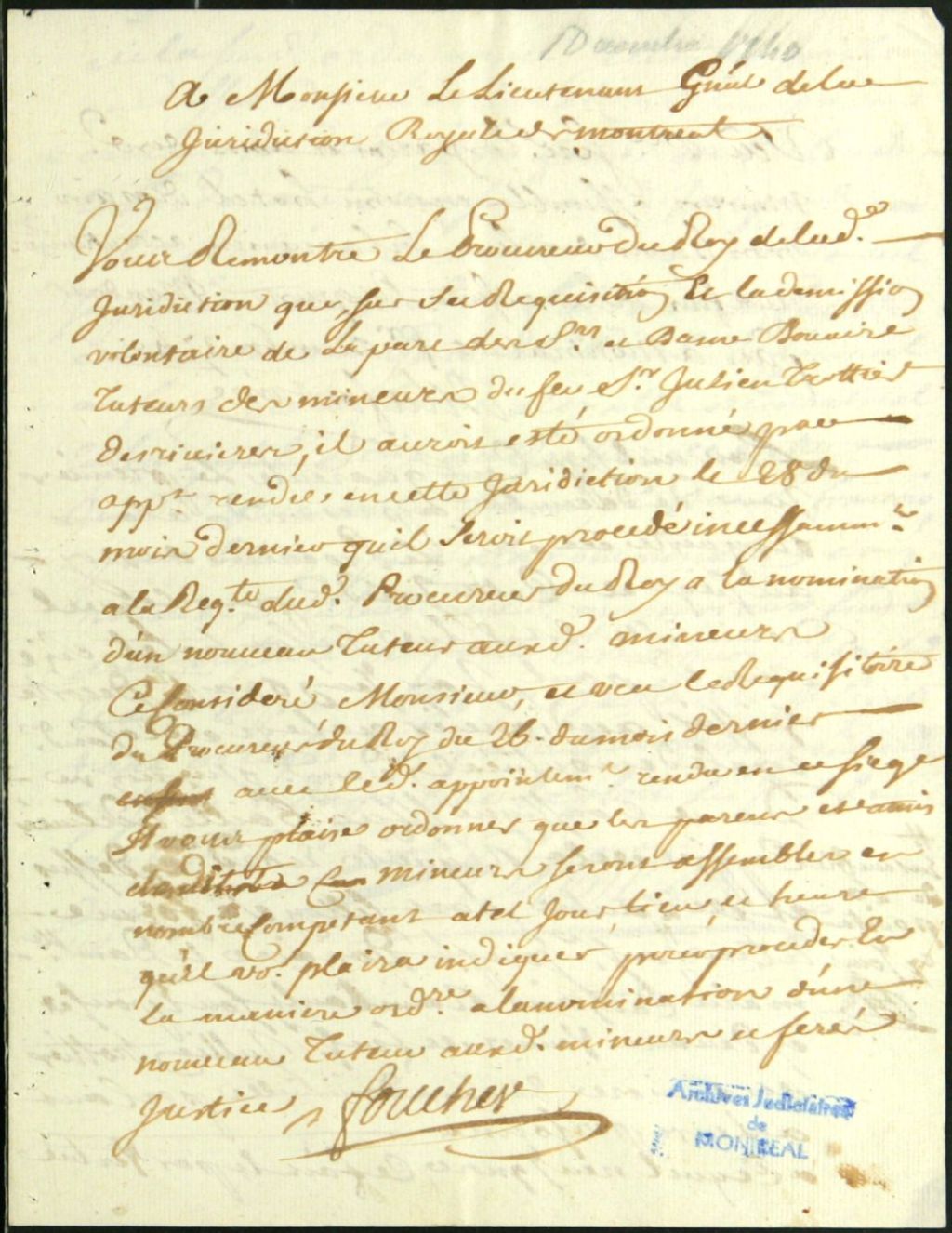 - Ce dossier d'administration judiciaire est composé des pièces suivantes : la requête pour la tenue d'une réunion de parents et amis des enfants mineurs de Julien Trottier pour faire élire un nouveau tuteur vu la démission volontaire de la part de Joseph Douaire et Marie-Catherine Raimbault ; la convocation ; la signification de la convocation à Joseph Douaire et son épouse ; les procurations de Montfort à Danré de Blanzy pour le représenter à la réunion ; l'excuse que produit Julien Rivard, tuteur nommé à la réunion du 2 décembre, pour ne pas accepter la tutelle ; la communication au procureur du roi Foucher, lequel requiert que Rivard demeure en place ; l'ordre de tenir une nouvelle assemblée pour discuter de la requête de Rivard ; les dires de Toussaint Pothier, subrogé tuteur à ce que Rivard ne soit pas déchargé et ceux de Joseph Douaire pour répondre à l'assignation de Rivard, exposant son refus à ce que Catherine Raimbault soit [...]