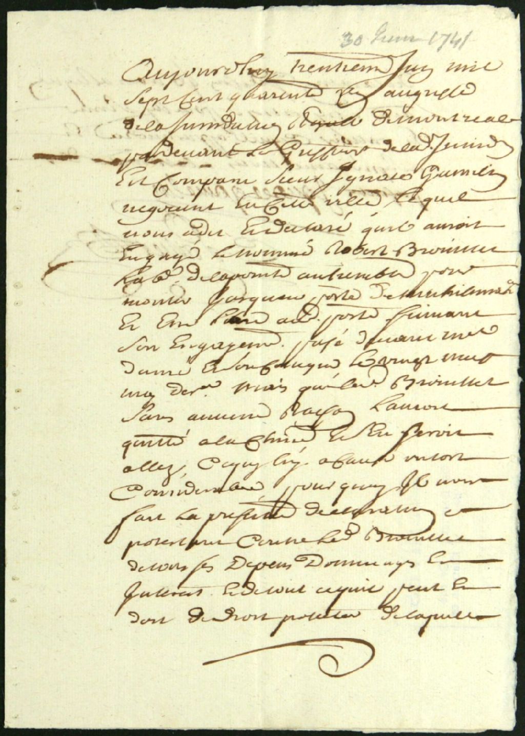 Déclaration de Ignace Gamelin, négociant, à l'effet que son engagé Robert Brouillet, habitant de Pointe-aux-Trembles, l'a quitté sans raison
