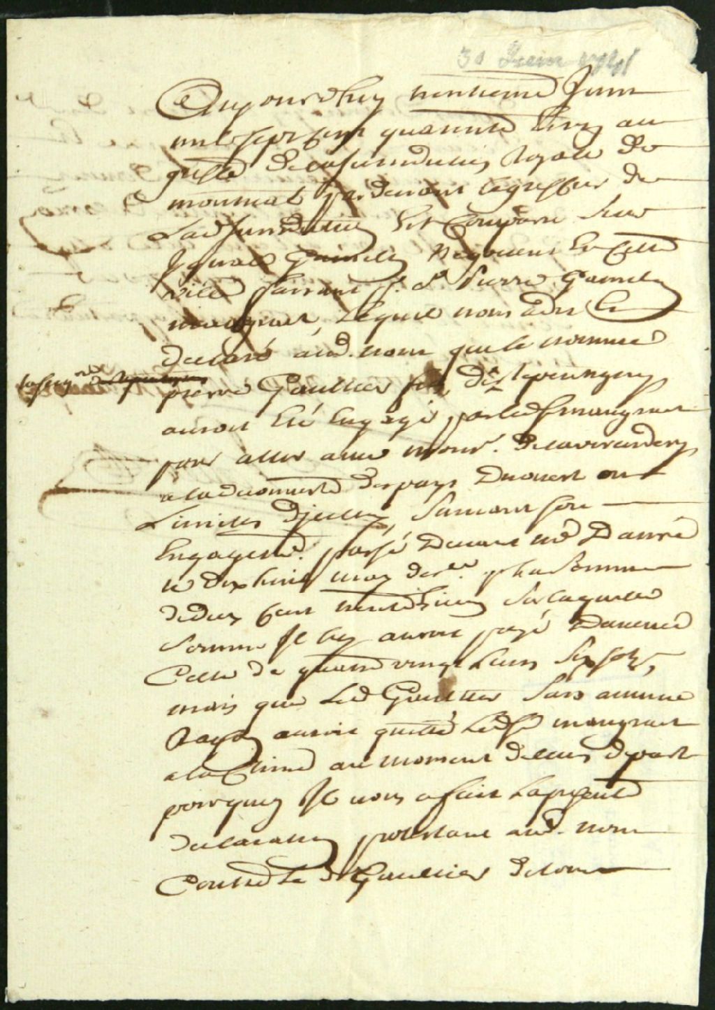 - Ce dossier d'administration judiciaire est composé de la déclaration faite au greffe par Ignace Gamelin, agissant pour Pierre Gamelin à l'effet que ce dernier a engagé Pierre Gauthier, fils, pour aller avec monsieur de LaVérandrye à la découverte des pays d'en haut, par contrat passé devant le notaire Danré de Blanzy le 18 mai 1741, mais que Gauthier a déserté au moment du départ malgré le fait qu'il lui a été payé une avance de 80 livres et 6 sols