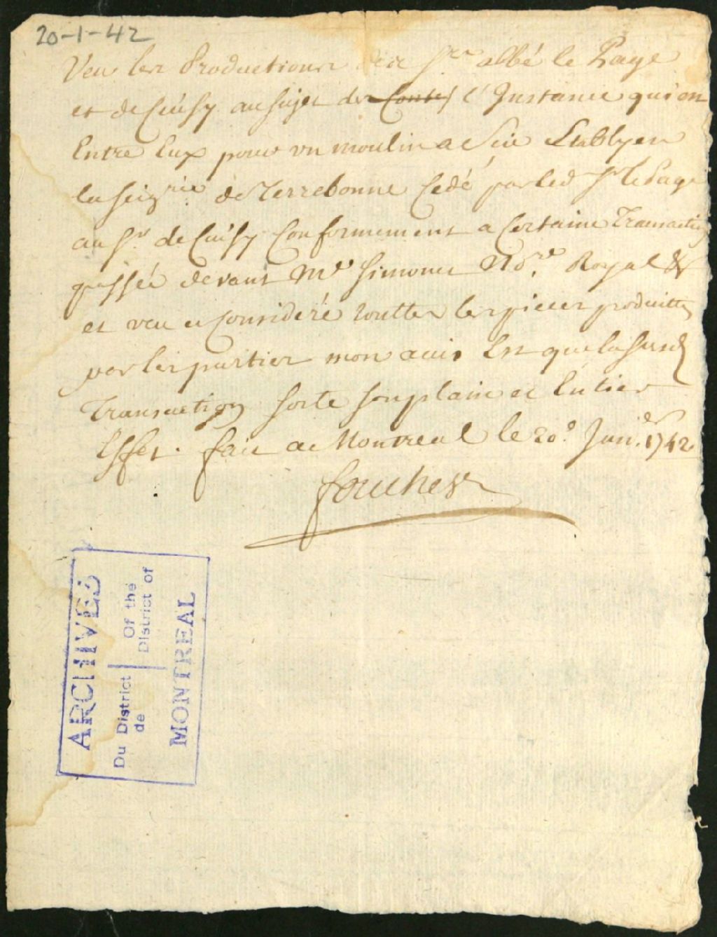 - Ce dossier de matière civile est composé des pièces suivantes : les conclusions du procureur du roi dans une poursuite intentée par Paul d'Ailleboust contre messire Louis Lepage de Sainte-Claire pour se faire restituer les 1100 pièces de bois de pins que ce dernier aurait pris dans un parc limitrophe au moulin ; et le dictum de sentence ordonnant au défendeur de payer ou remettre le bois qu'il a pris dans le parc