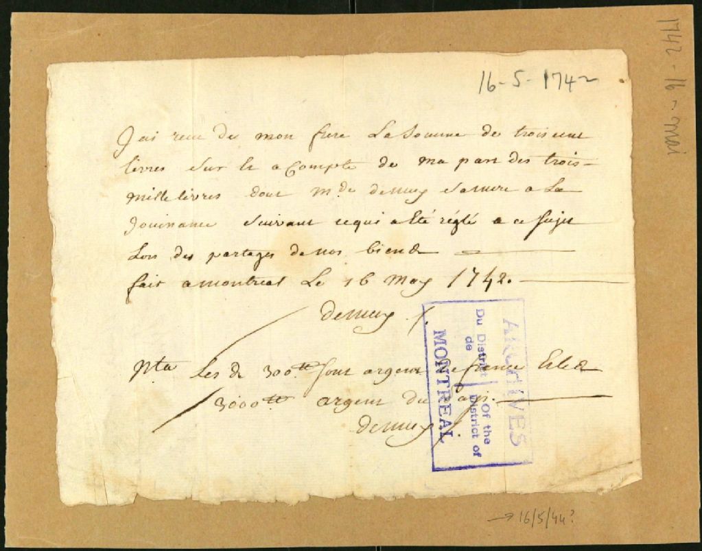 Quittance de [Jacques-Pierre Daneau de Muy?] à [Jean-Baptiste Daneau de Muy?], 16 mai 1742, Archives nationales à Montréal, Fonds Juridiction royale de Montréal, (06M,TL4,S1,D4852).