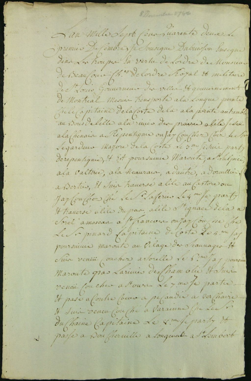 Procès devant le Conseil de guerre contre François Marteau dit Lespérance, soldat de la Compagnie de LaGauchetière, accusé de désertion, 8 décembre 1742 - 11 décembre 1742, Archives nationales à Montréal, Fonds Juridiction royale de Montréal, (06M,TL4,S1,D4905).