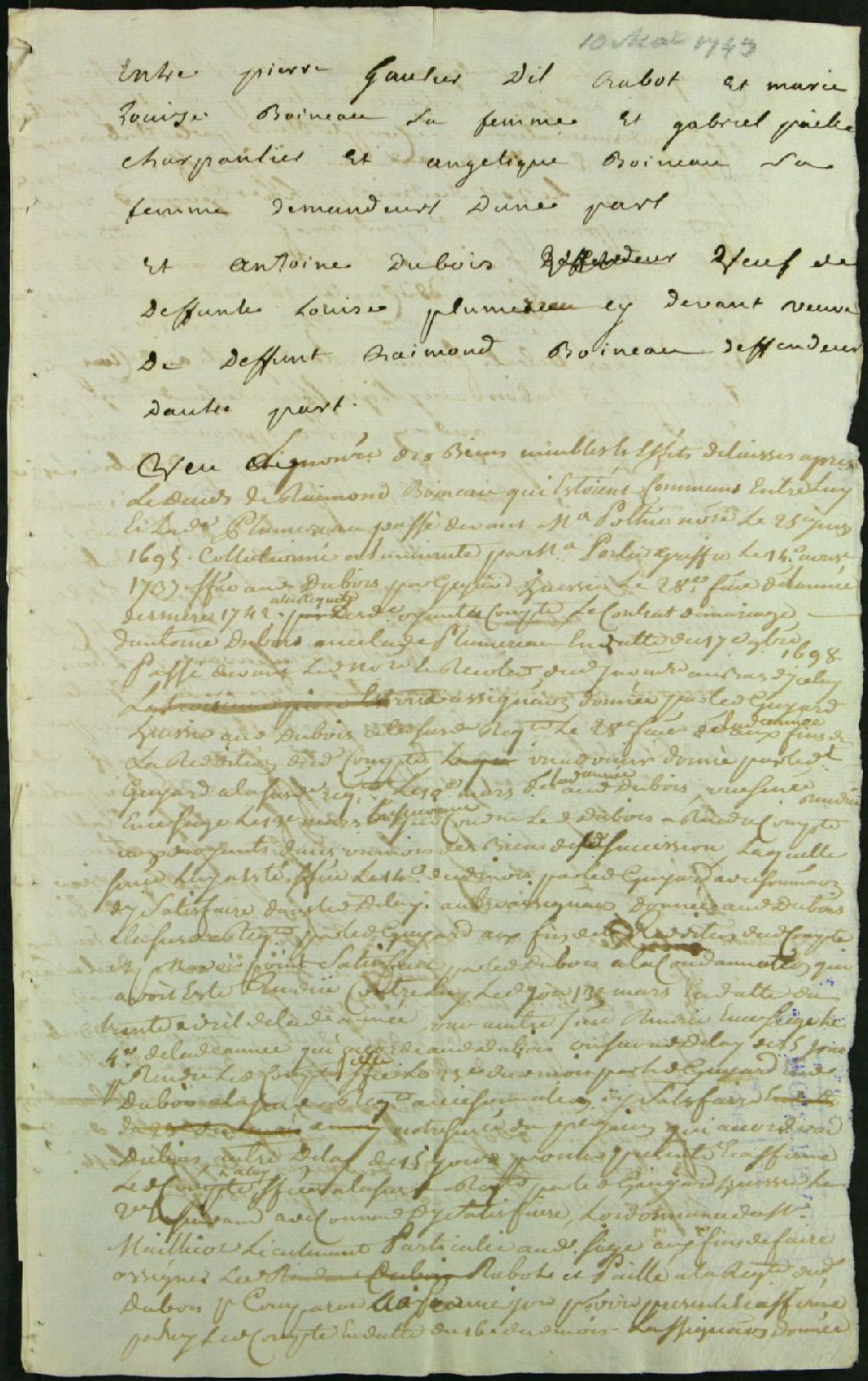 Procès entre Gauthier dit Rabot, époux de Marie-Louise Boineau, et Gabriel Paillard, charpentier, époux d'Angélique Boineau, demandeurs, et Antoine Dubois, veuf de Louise Plumereau, veuve de Raymond Boineau, défendeur, pour partage d'héritage