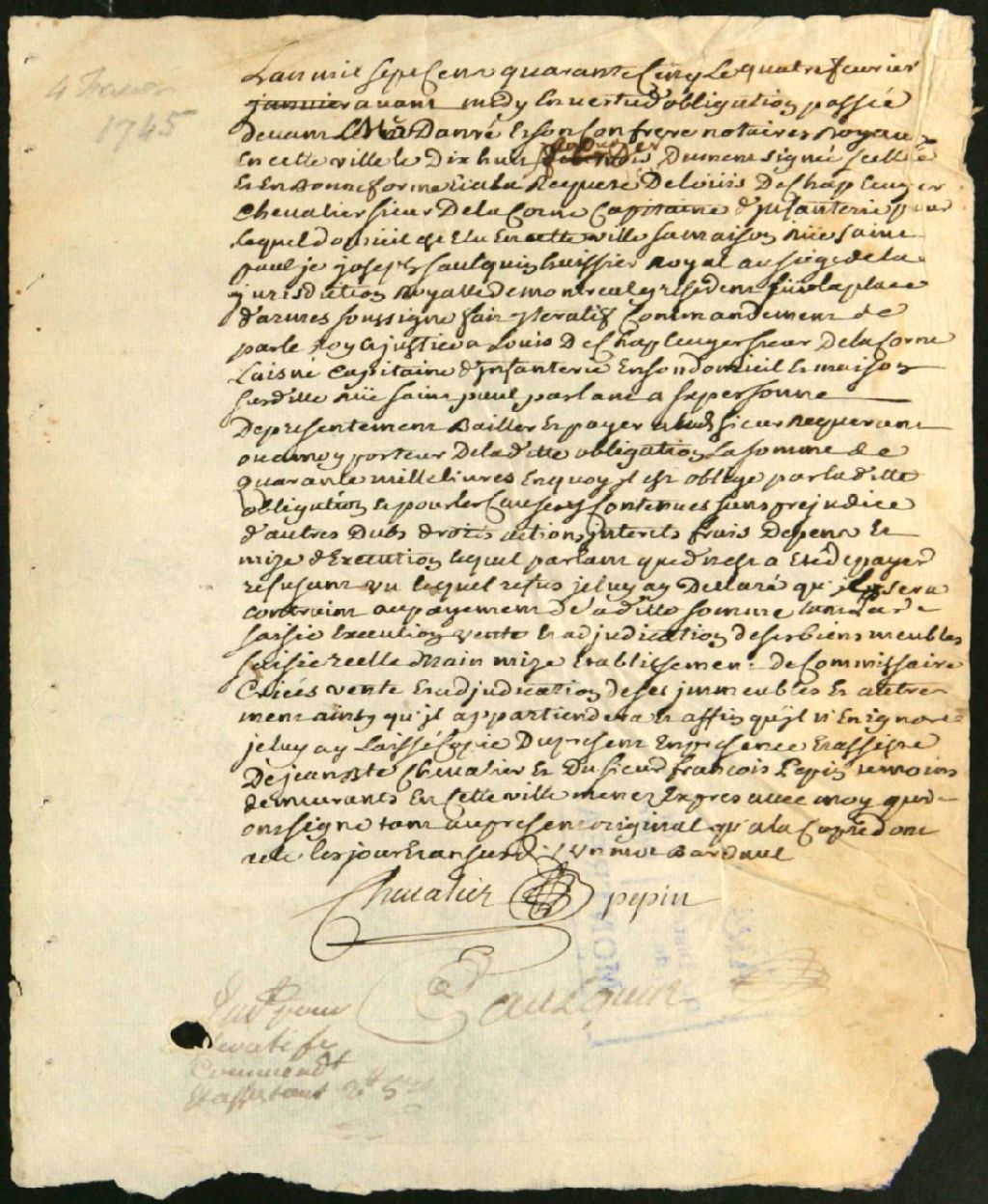 Procès entre Louis de Lacorne, sieur de Chapt, chevalier de l'ordre de St-Louis, capitaine, demandeur, et Louis de Lacorne, l'aîné, capitaine, pour le payement d'une obligation